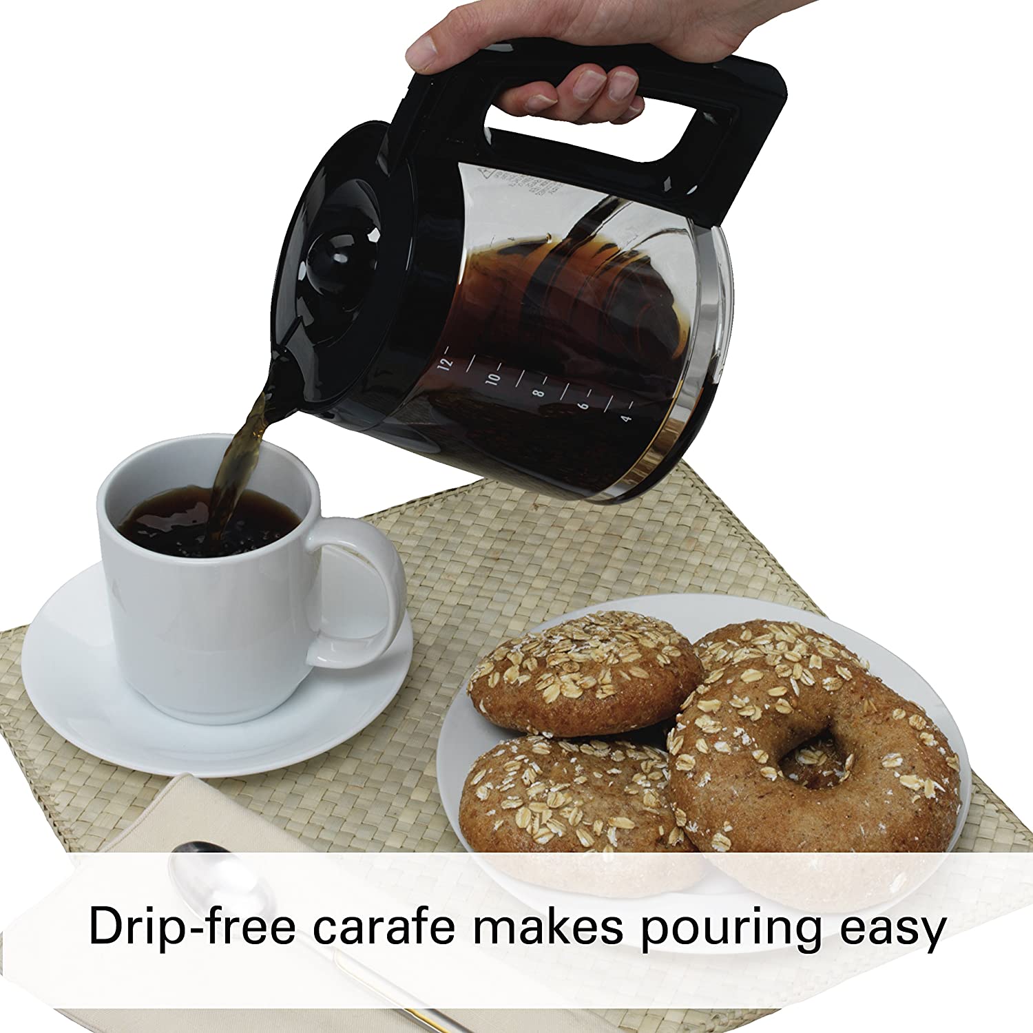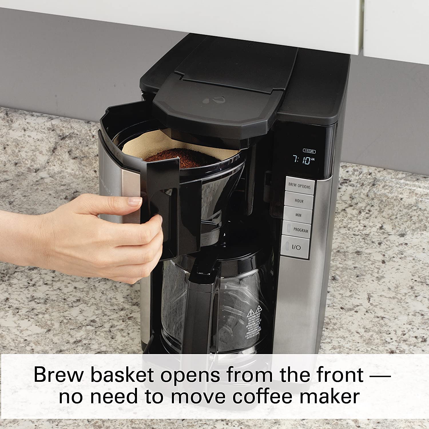 Finally, a coffee maker that can stay tucked under a cabinet when in use. With front access to the water reservoir and brew basket, The Hamilton Beach programmable easy access Coffee maker puts an end to the back and forth maneuvering of a countertop Coffee maker. This plus 46381 includes premium features for high-end performance including a cone filter for maximum Coffee extraction, Three brewing options and a freshness indicator. A drip-free carafe makes for clean pouring, and the filter basket has a handle for mess-free grounds disposal. Plus with an automatic, optional cleaning cycle reminder, you can ensure your machine is brewing the best tasting coffee. With its compact design, This Coffee maker takes up less space but still makes up to 12 Cups. Free cone Coffee filters are included.
