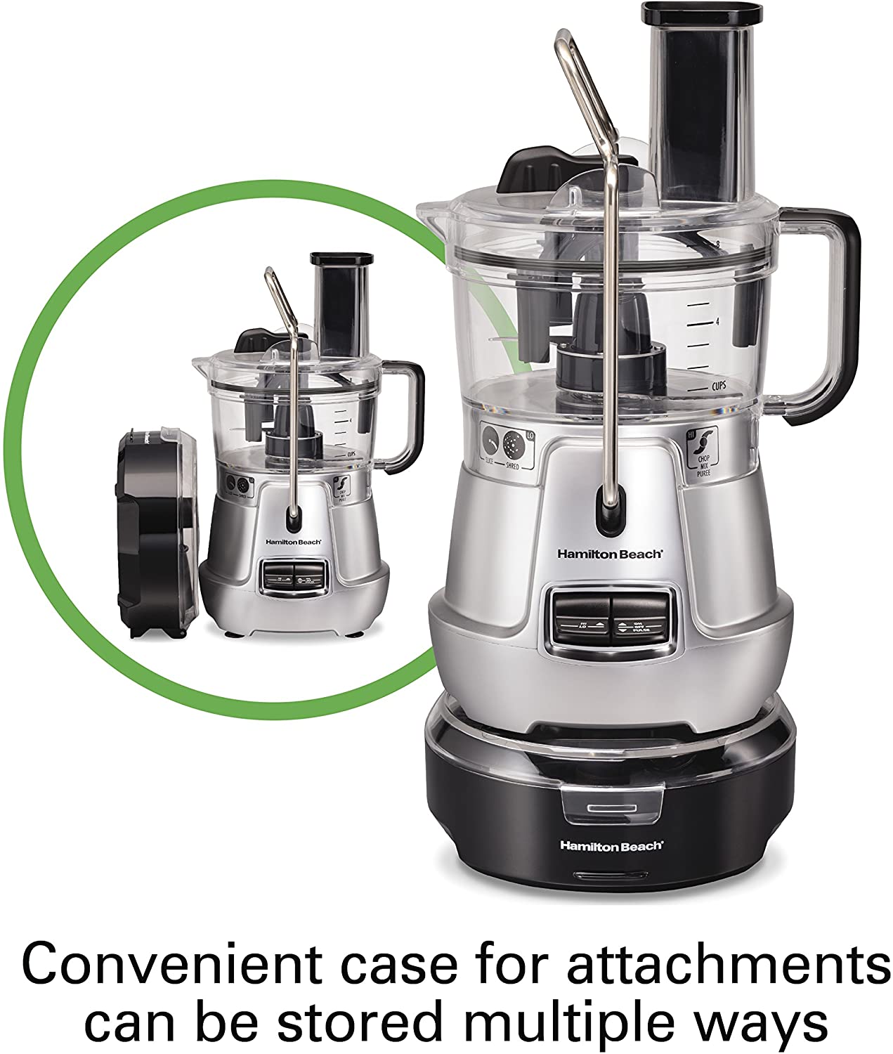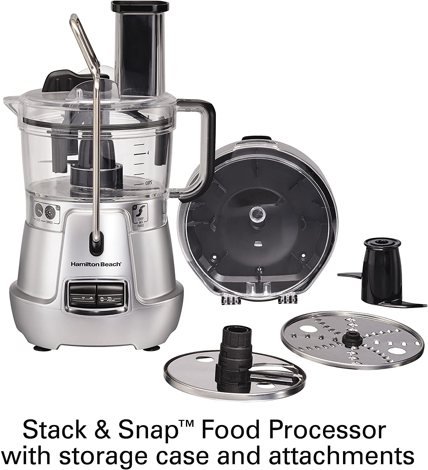 The Hamilton Beach stack and snap food Processor lets you chop, puree, slice, shred and knead dough with ease. There’s no twist locking required for assembly – just stack the bowl onto the base and snap on the lid. The five attachments, including a built-in bowl scraper, save prep time and effort.