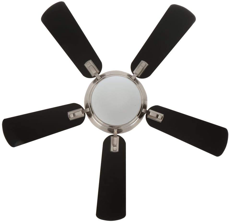 Hampton Bay Midili 44 in. LED Indoor Brushed Nickel Ceiling Fan 91044 New The Hampton Bay Midili 44 in. Brushed Nickel Ceiling Fan has reversible black or rosewood blades, a brushed nickel finish and a frosted opal glass light kit that provides an eye-catching accent to your home decor. The Midili offers a contemporary yet compact flywheel design and has a remote control that allows you to choose between 3 speeds and control the light kit. Uses one 9.5 Watt LED bulb.