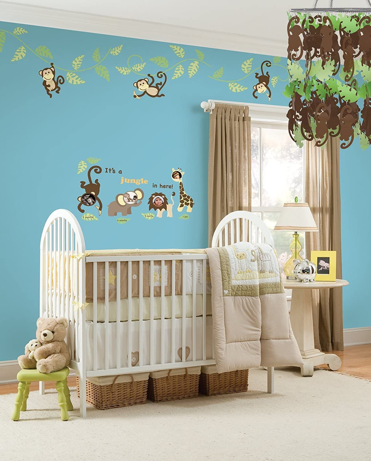 Happy monkeys, swinging from the trees with bananas adds some jungle fun to your childs room! These wall art decals bring imagination and happiness to the walls. This kit comes with 2 sheets of fun-loving monkeys and vines to create your splendid scene, measuring 45.5"h x 52"w!