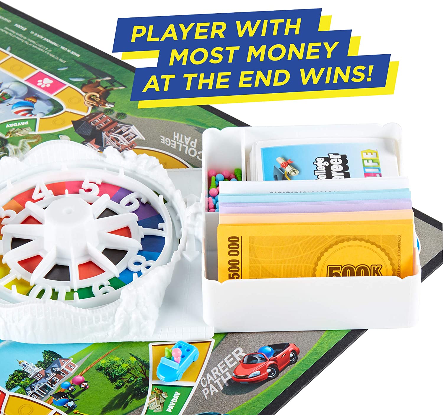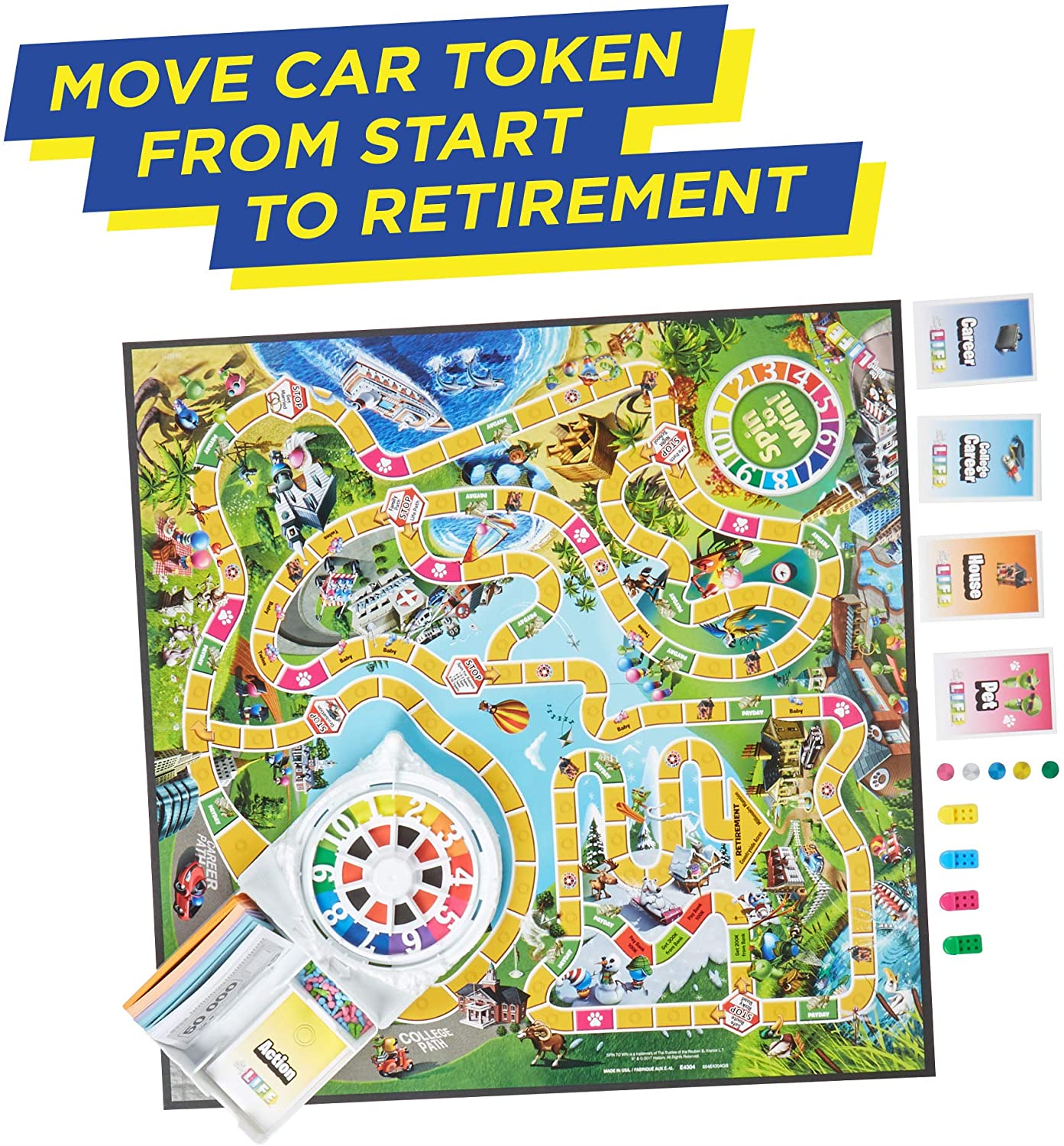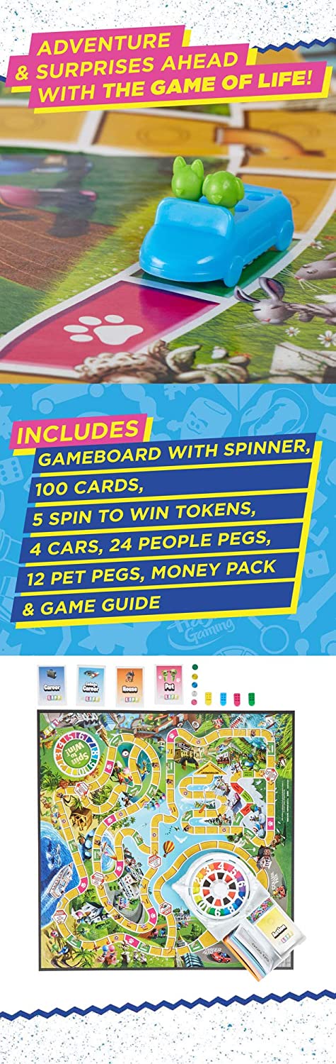 In The Game of Life game players choose a path and move their car tokens around the gameboard from Start to Retirement. Who is headed for wealth and fortune? Pick a path for a life of action, unexpected surprises, and dream vacations, but spend cash wisely because the wealthiest player at the end wins the game. For 2 to 4 players