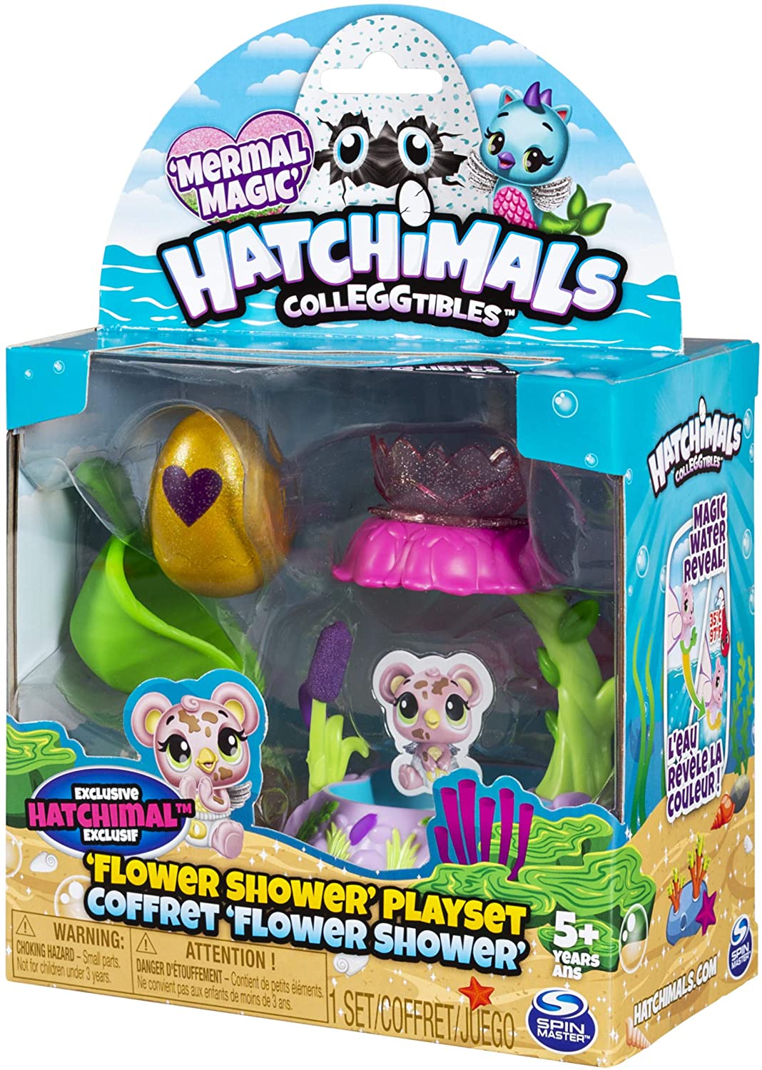 After HatchiBabies romp through Mischief Marsh, they need a Flower Shower! Give your muddy HatchiBaby (included) a scrub-a-dub-dub in this super-cute playset and see their mud spots disappear! The fun begins when you place your exclusive HatchiBaby in the pool and fill the leaf bucket with water. Tip the water from the leaf bucket into the sparkly pink flower blossom, then twist the blossom to start the shower! As the water sprinkles over your muddy HatchiBaby, use the removable purple cattail for scrubbing! With a few strokes, their muddy spots will magically disappear! Once your HatchiBaby is nice and clean, wipe them down with the leaf towel and hang the towel on a branch to let it dry. Since HatchiBabies get dirty quickly, you can bathe your lil’ cutie again and again! You can even give other Season 5 Hatchimals CollEGGtibles a shower and use the pond to reveal their magical underwater color change! Turn your messy HatchiBabies into squeaky-clean cuties with the magical Flower Shower Playset.
