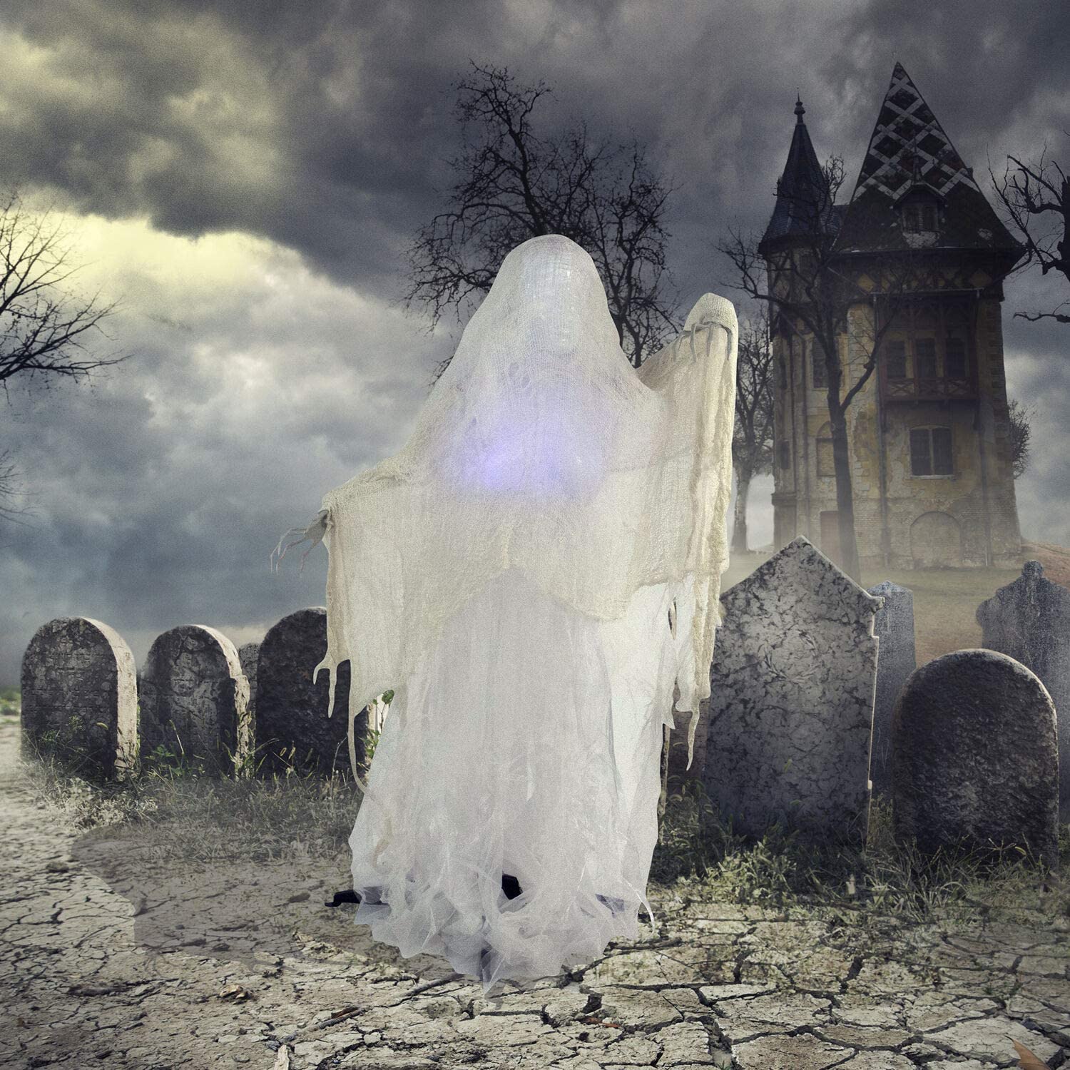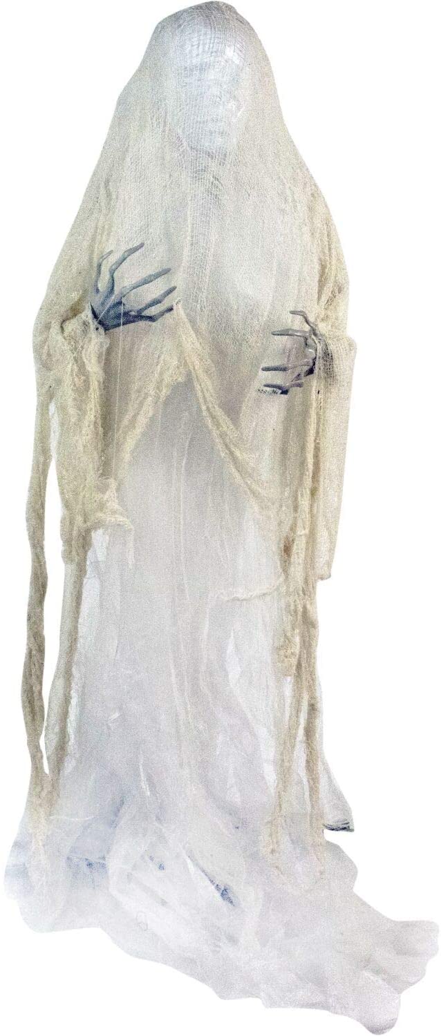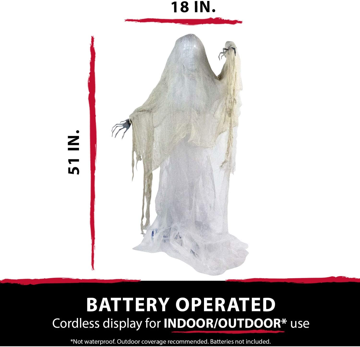 • MULTI-FUNCTIONAL : Creepy and spooky! White ghoul has motion and lights up. She will turn your home into a haunted house in no time. Prop on the stand or hang in your yard for a floating graveyard look.