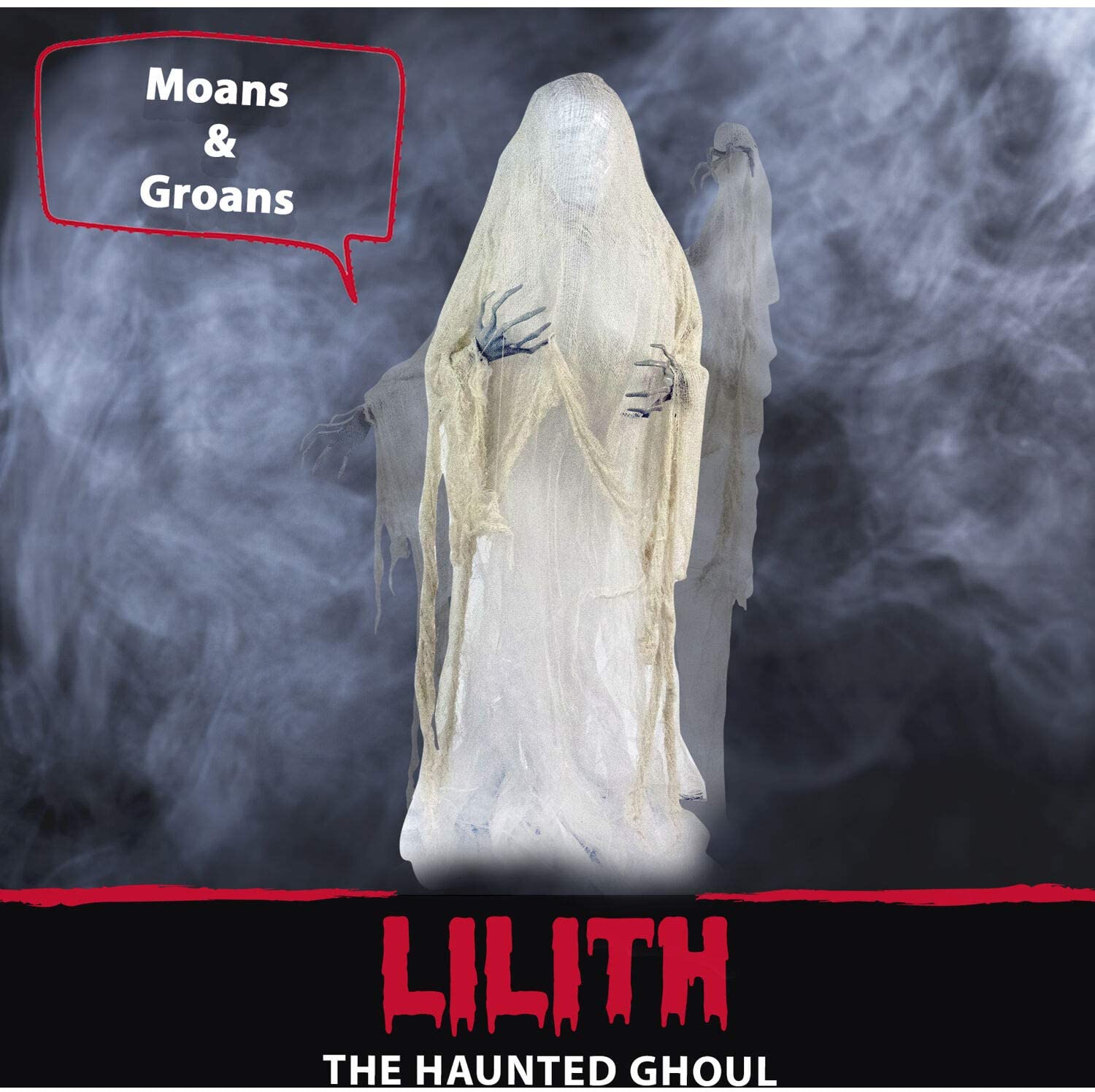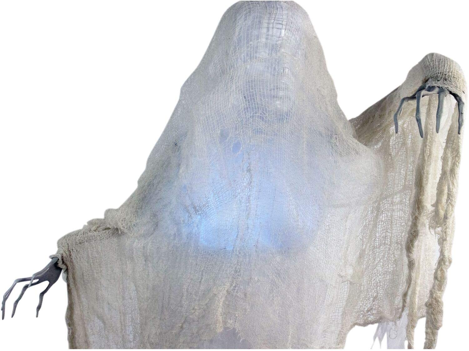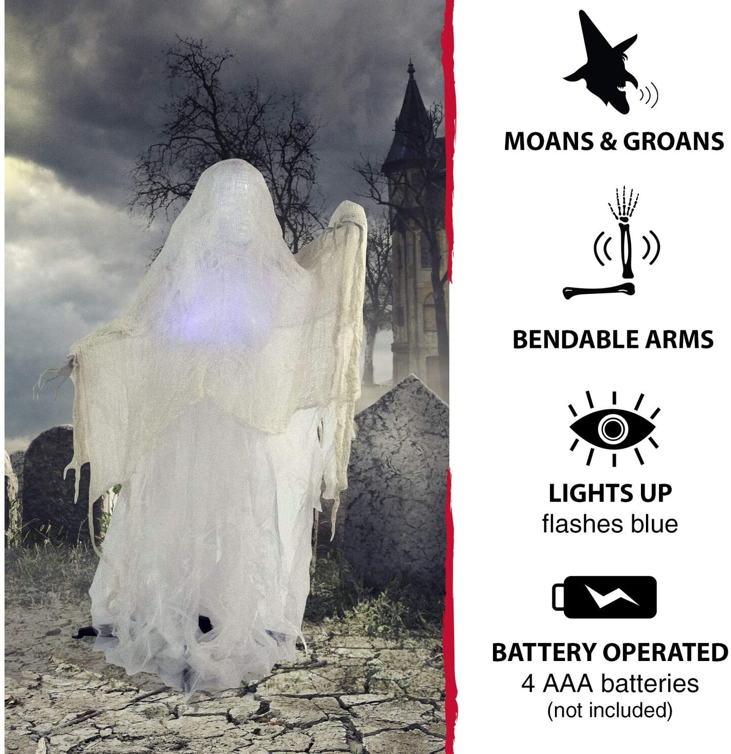 • MULTI-FUNCTIONAL : Creepy and spooky! White ghoul has motion and lights up. She will turn your home into a haunted house in no time. Prop on the stand or hang in your yard for a floating graveyard look.