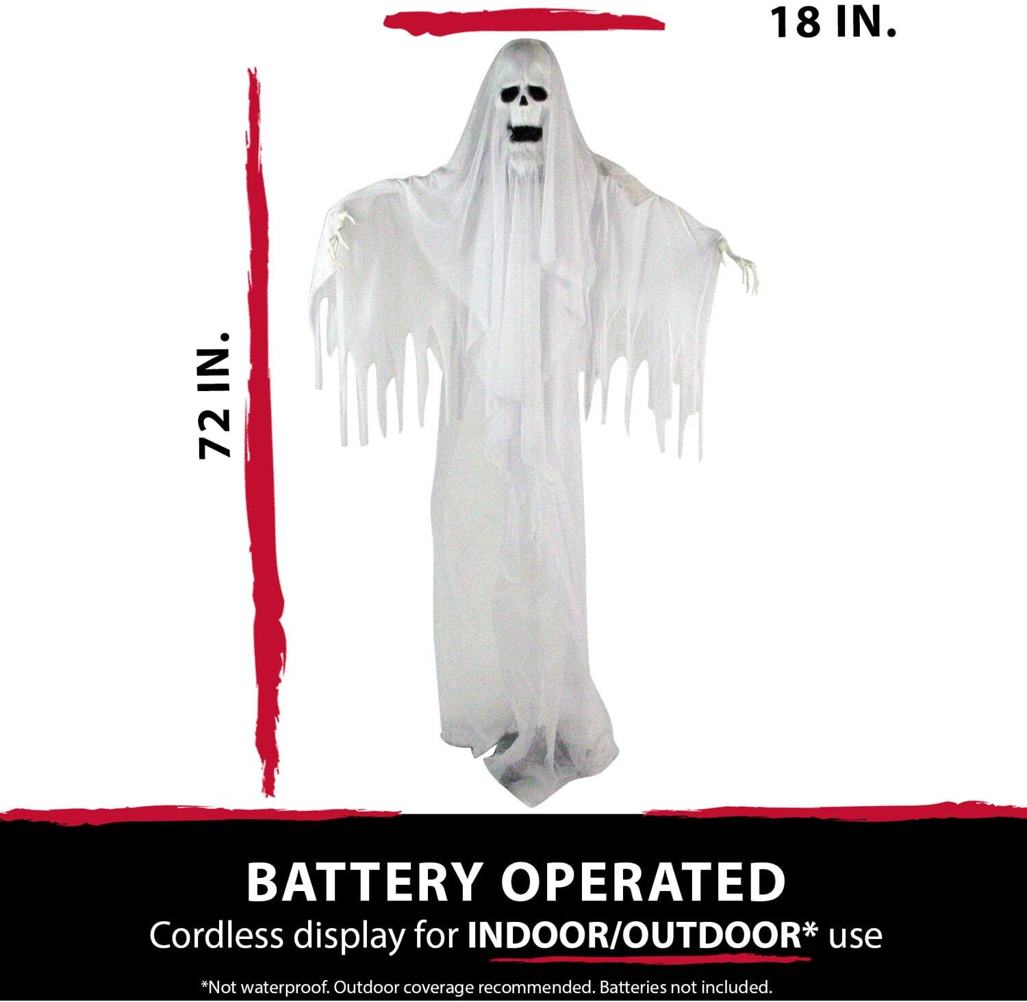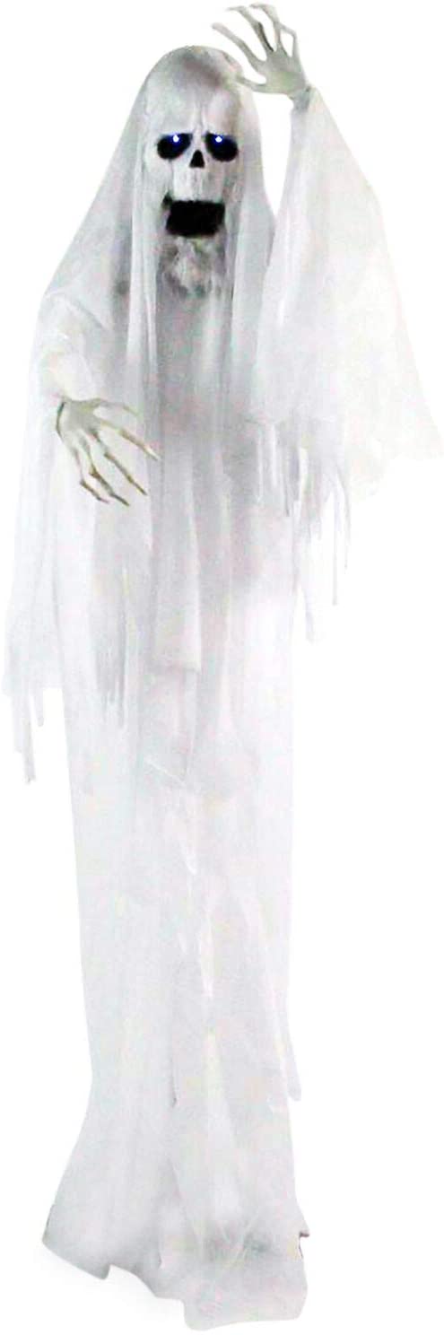 - LIFE-SIZE ANIMATRONIC: Poseable ghost figure is perfect for your indoor or (covered) outdoor decor. Display your talking spirit decoration in any room of your home to show his scary and evil ways at your next party.