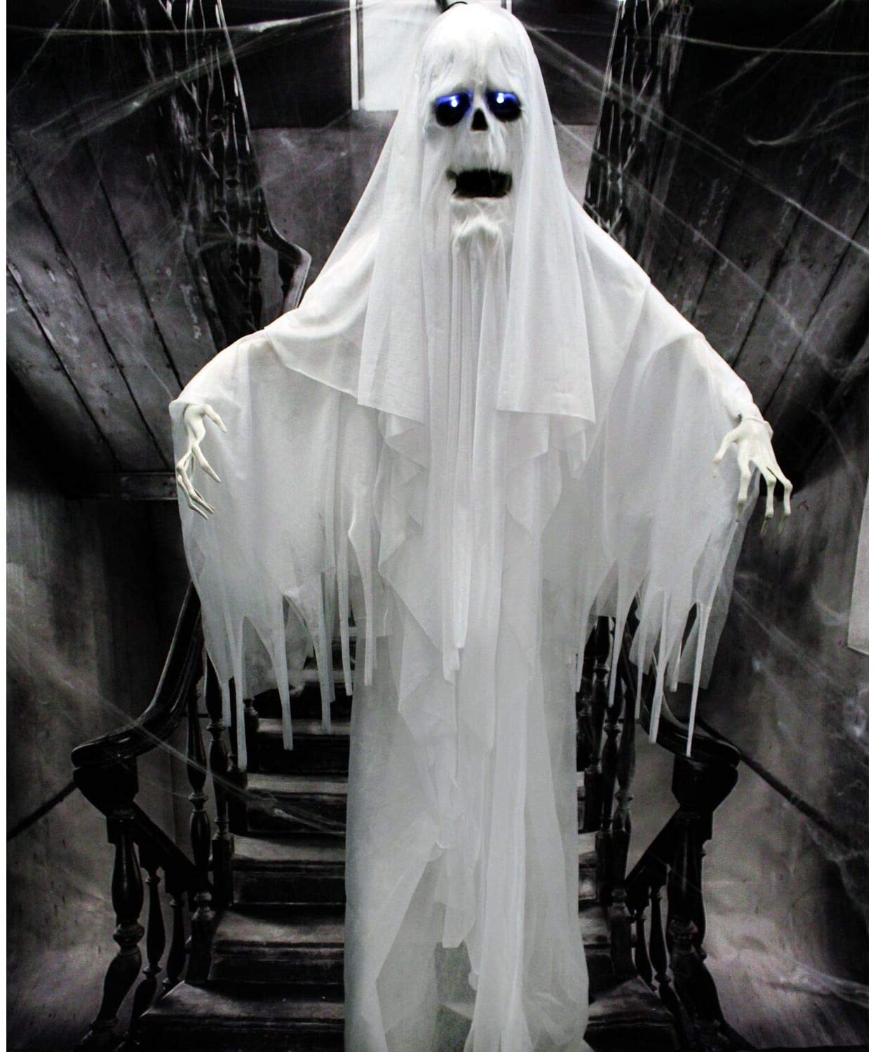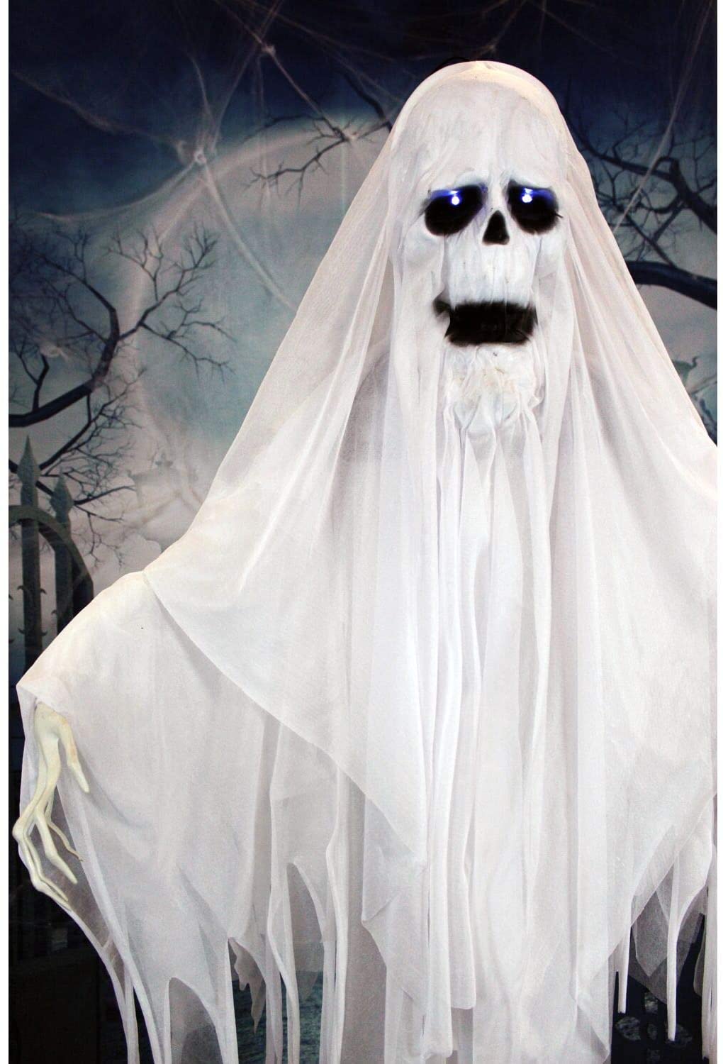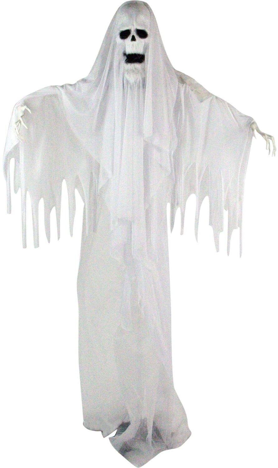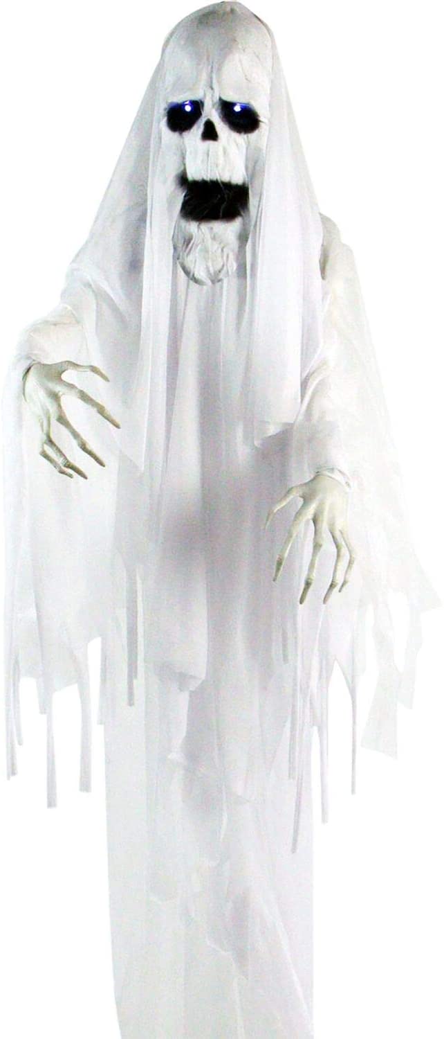 - MULTI-FUNCTIONAL : Creepy and spooky! White ghoul has motion and lights up. He will turn your home into a haunted house in no time. Prop on the stand or hang in your yard for a floating graveyard look.