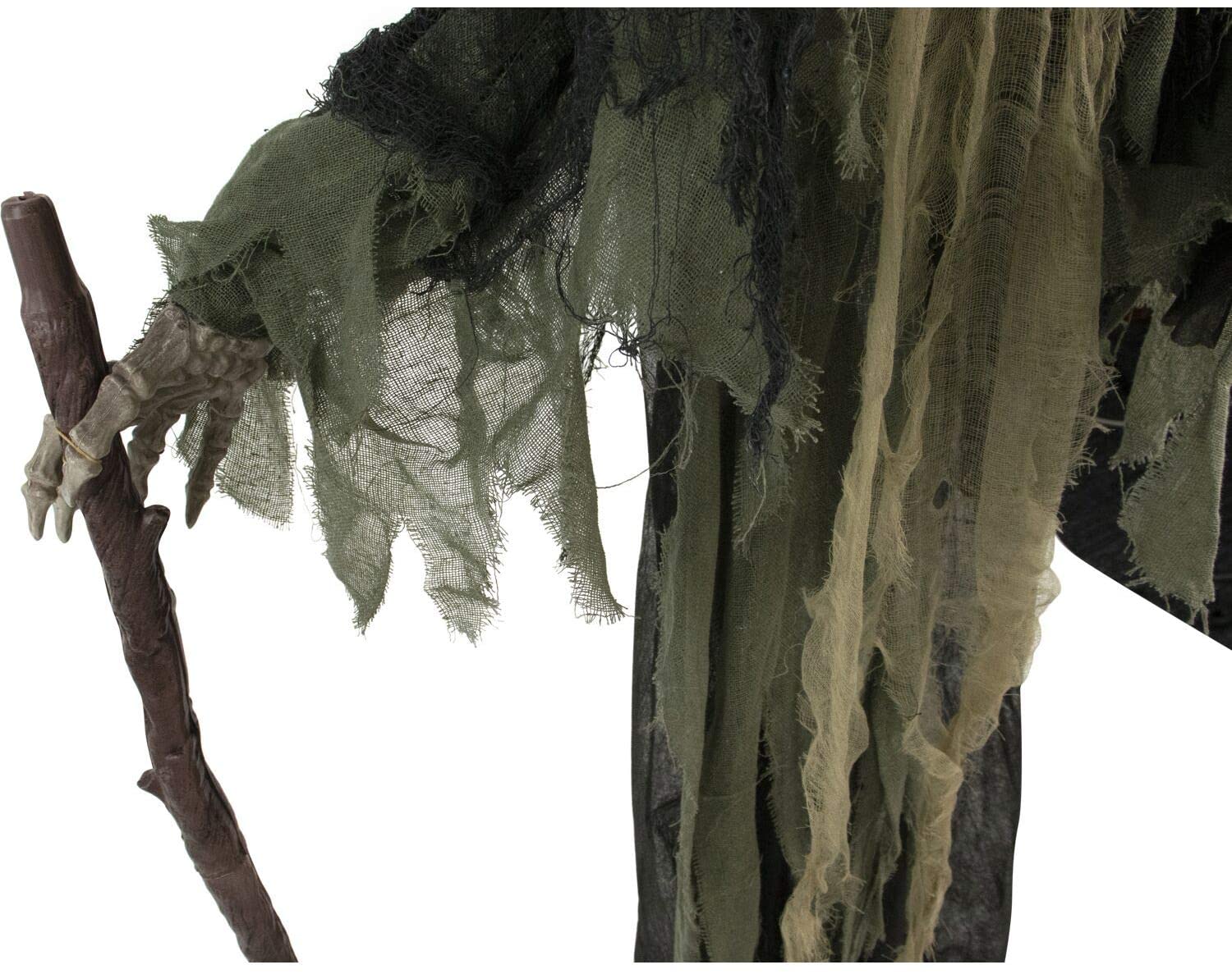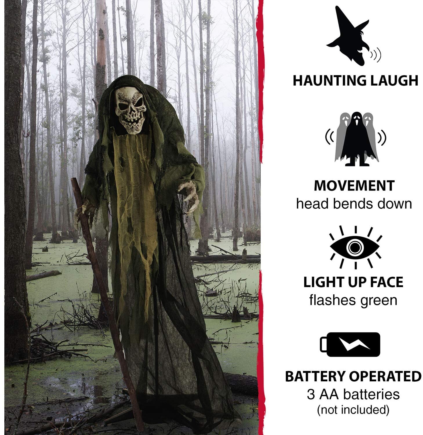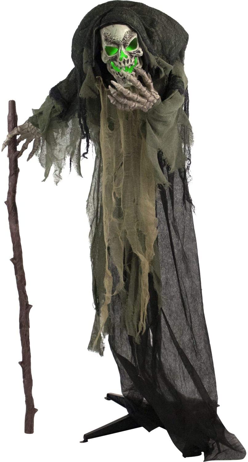 • MULTI-FUNCTIONAL Prop: Creepy and spooky! This animated reaper lights up and moans. He will turn your home into a haunted house in no time. Prop on the stand or hang Jinx for a spooky graveyard look.