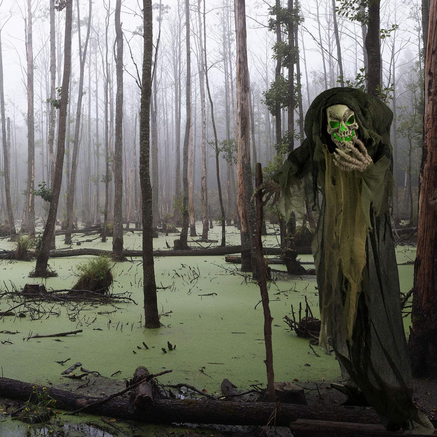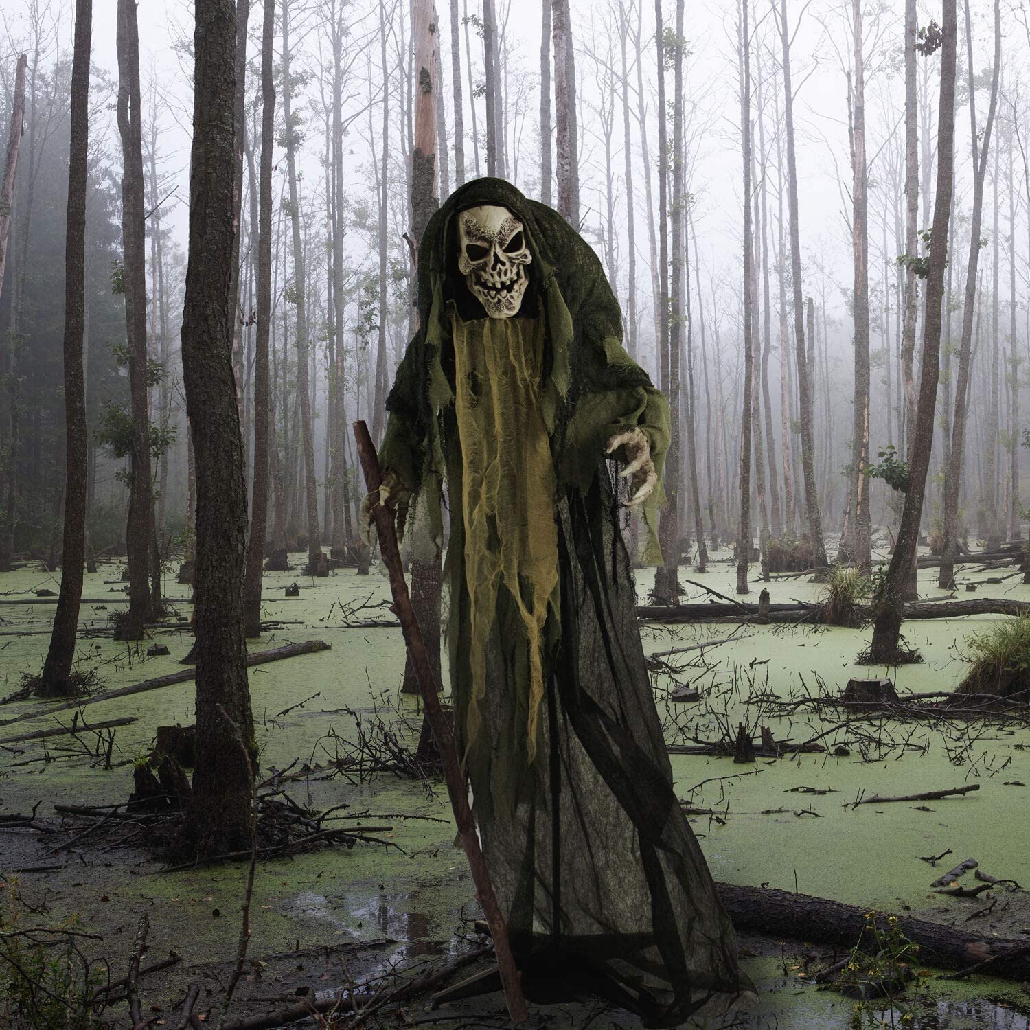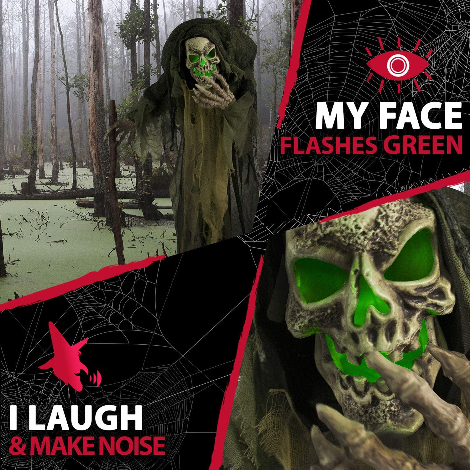 • MULTI-FUNCTIONAL Prop: Creepy and spooky! This animated reaper lights up and moans. He will turn your home into a haunted house in no time. Prop on the stand or hang Jinx for a spooky graveyard look.