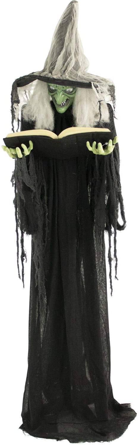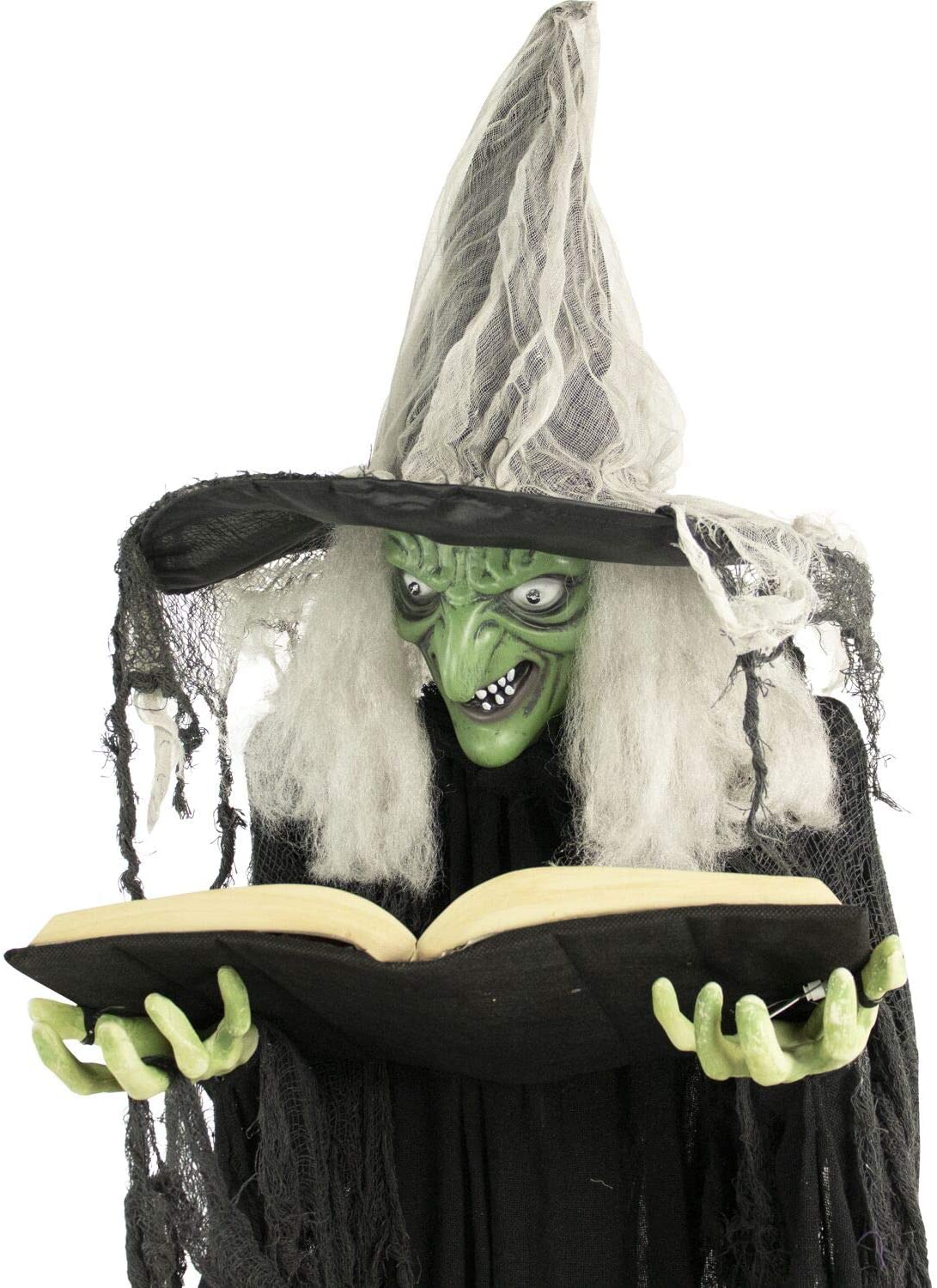 - LIFE-SIZE ANIMATRONIC: Poseable Halloween witch is perfect for your indoor or (covered) outdoor decor. Display your animated decoration in a variety of different ways from funny to spooky and everything in between.