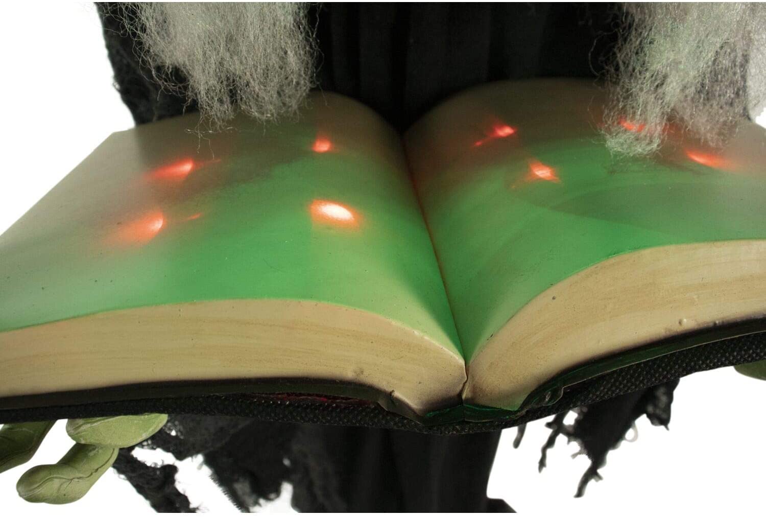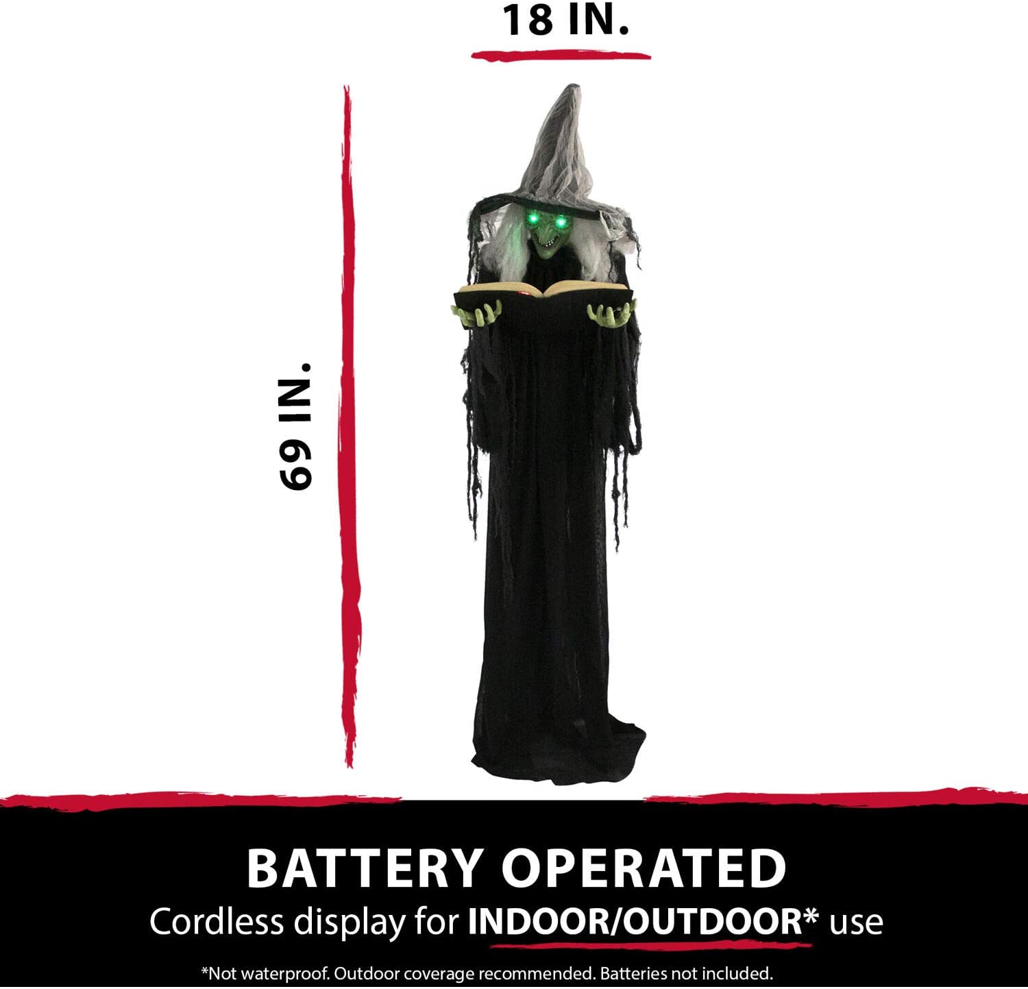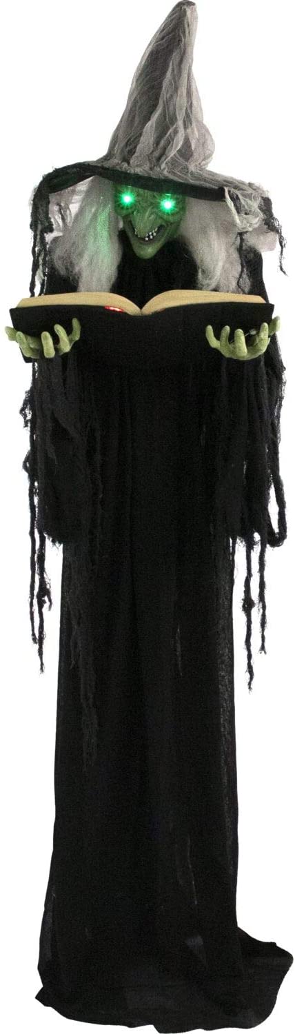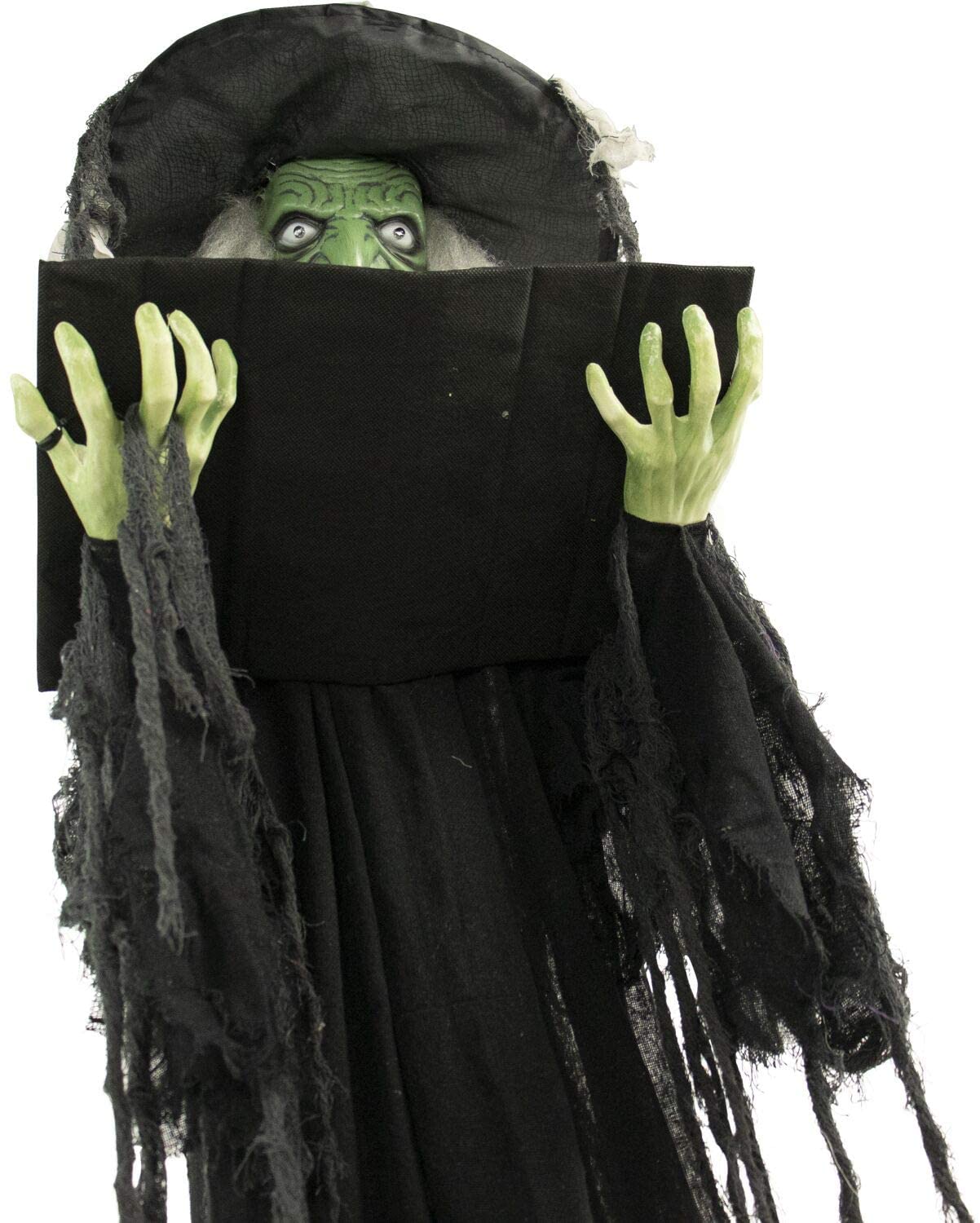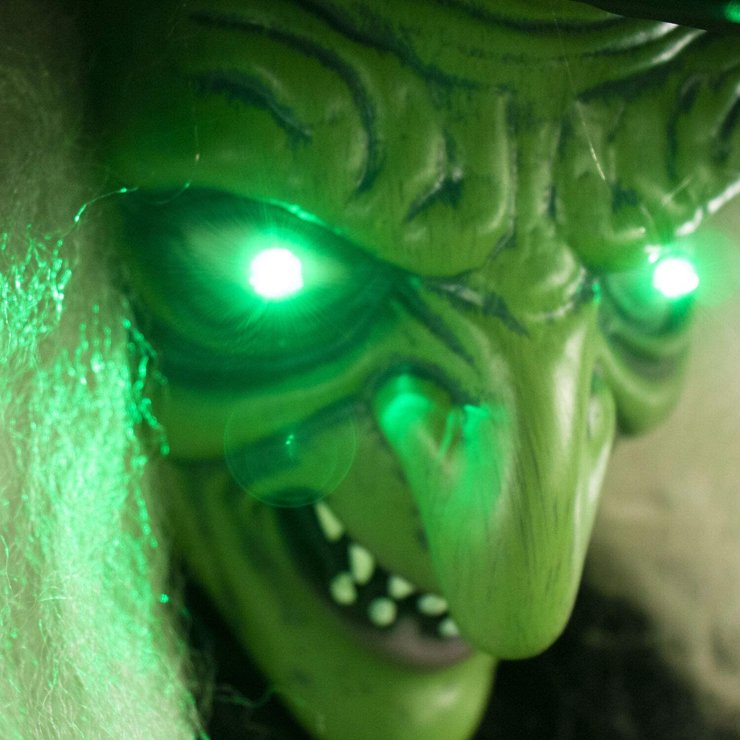 - MULTI-FUNCTIONAL : Creepy and scary! This wicked sorceress' eyes light up green and has sound. She will turn your home into a haunted house in no time. Line up or hang multiple witches for an eery graveyard look.