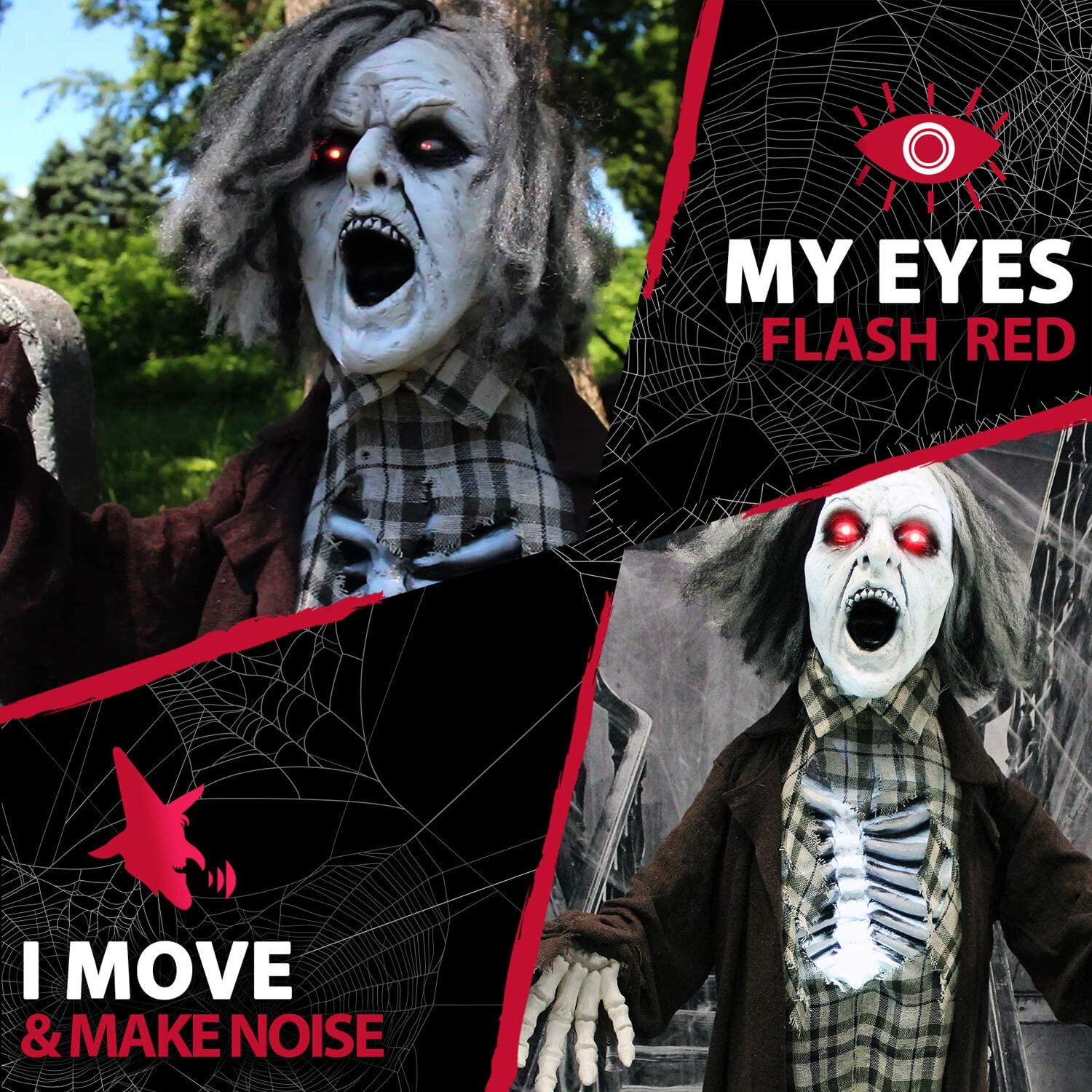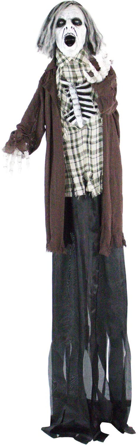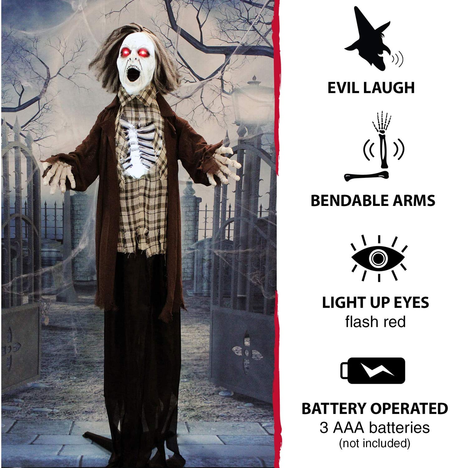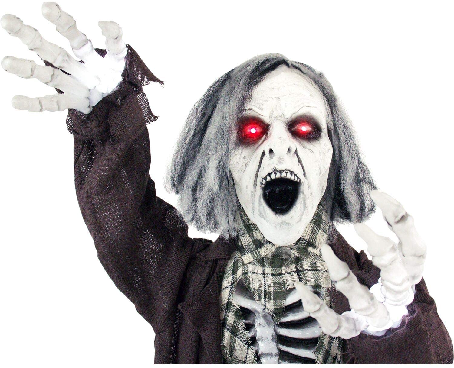 MULTI-FUNCTIONAL Prop: Creepy and spooky! This undead ghoul lights up, talks, and has motion. He will turn your home into a haunted house in no time. Prop on the stand or hang the ghostly creature for an eery graveyard look.