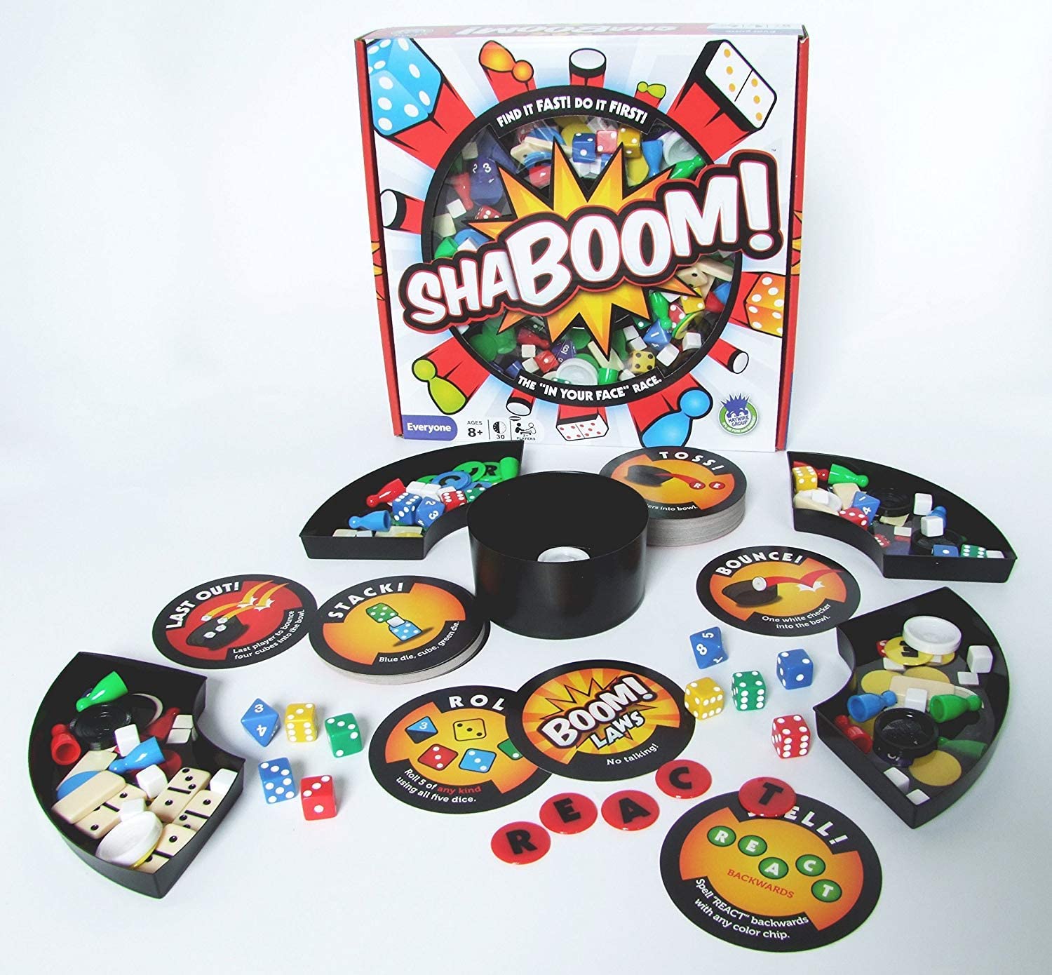 Face off against your opponents in a series of challenges sure to test your speed and agility. Actions that anyone can do. It all comes down to who can do it first. Stack it. Roll it. Spell it. SHABOOM!