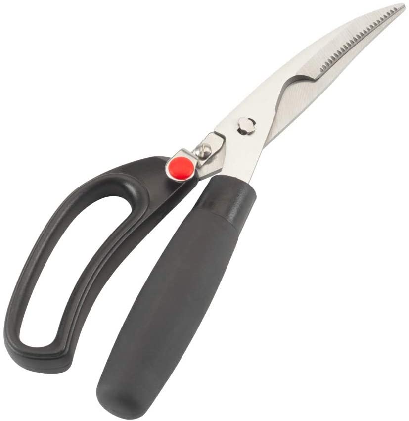 Always have a pair of poultry shears handy for your BBQ needs, when you need to slice cuts of meat off bone or simply to make bite-sized portions while cooking. These heavy-duty shears are designed with an ergonomic handle for a comfortable grip, able to apply optimum leverage as you cut. A notch in the blade is good for cutting through poultry bones. A dependable pair of shears can also have a number of uses in your kitchen for food prep when taking out your knife may not be necessary—you might want to quickly snip off herbs or cut through shellfish. Shears offer the ability to reach certain tasks that you may not be able to finesse with a knife, and they are often used to simply open stubborn packaging. Our shears come with locking handles for safe storage when not in use, and can pull-apart for easier cleaning. Hand washing is recommended.