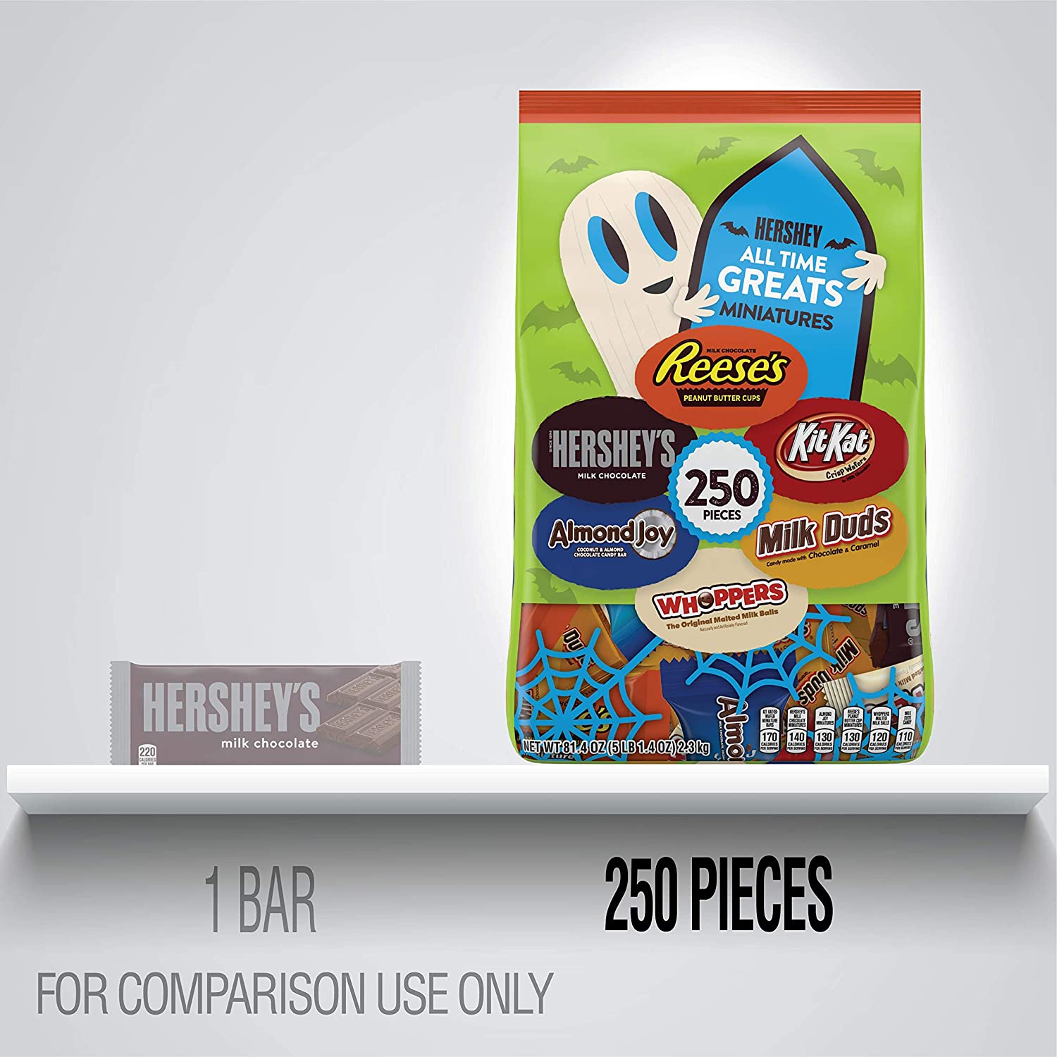 Delight all your trick-or-treaters and guests this Halloween with this delicious assortment of Hershey candies, including classic HERSHEY'S Milk Chocolate miniature bars, creamy REESE'S Peanut Butter Cups Miniatures, crispy kit KAT Wafer Bar Miniatures, chewy milk DUDS candy, crunchy WHOPPERS malted Milk Balls, and delicious almond JOY miniature candy bars. Stock up so you'll have enough for Halloween parties, candy dishes and snacking, too!