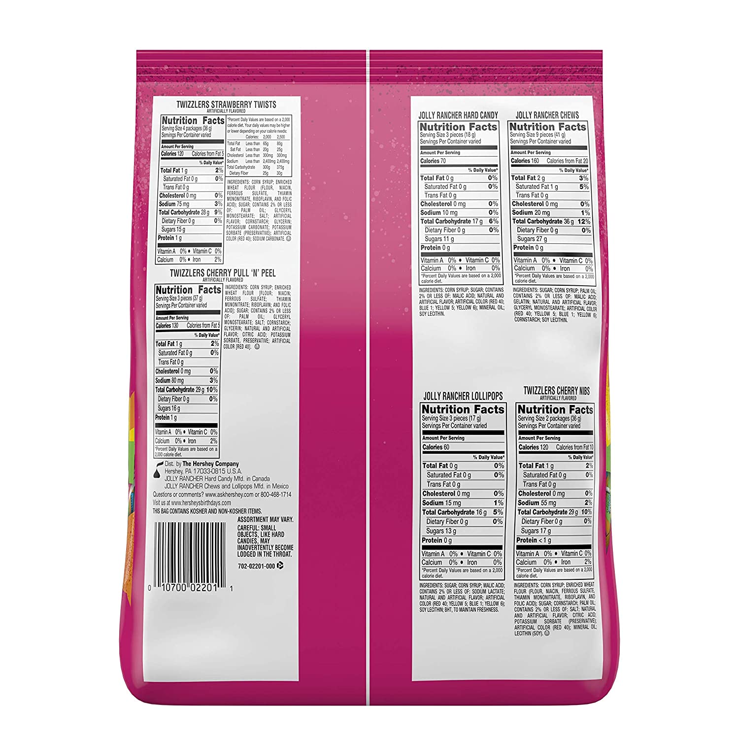 Jolly Rancher and Twizzlers Party Mix is a variety pack of all your favorite Jolly Rancher and Twizzlers fruit flavored candy. This bag of candy is perfect for celebrations or for keeping your candy dish filled. Enjoy a fun candy assortment with Jolly Rancher fruit chews, lollipops and hard candy, as well as Twizzlers Nibs candy in cherry flavor, Twizzlers Twists candy in strawberry flavor and Twizzlers Pull ‘n’ Peel candy in cherry flavor. Assorted hard candy and soft candy are great for any holiday, from Halloween to Easter. Packed in a shareable bag.