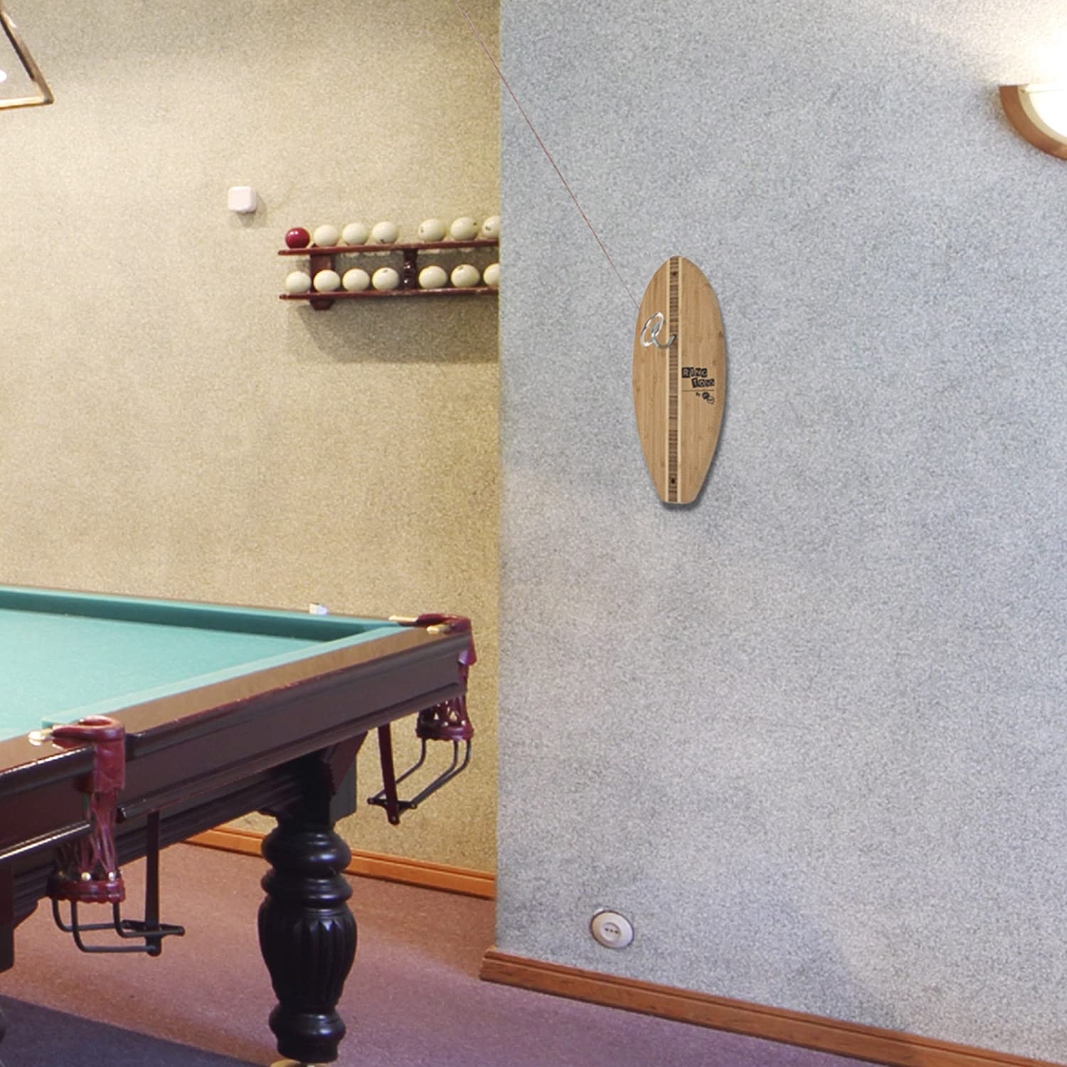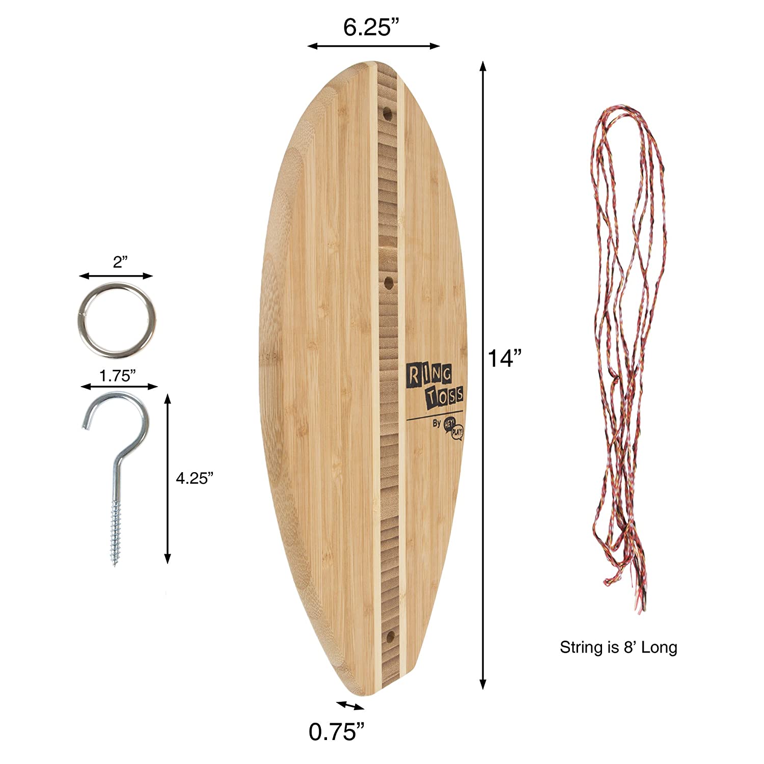 • PRODUCT DETAILS – Complete set includes game board made of bamboo and measuring 14” long  x 6.25” wide x .75” deep, mounting screws and double sided tape to hang board, string hook, ring and string, and eye hook to catch ring.  An additional string is included if you want to play with a different length and thickness of string.