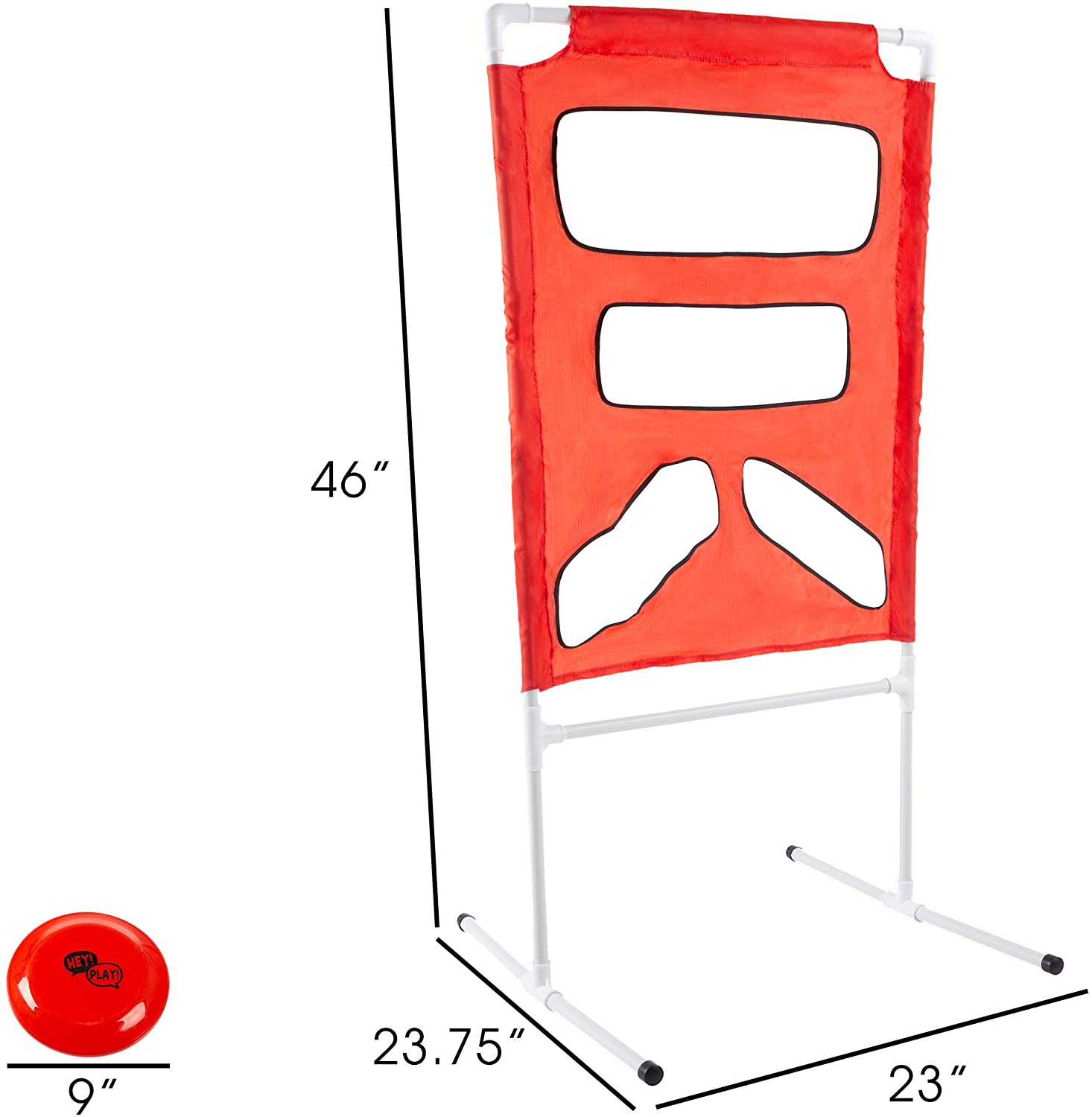 • PRODUCT DETAILS- Materials: PVC, Plastic and Canvas. Target Dimensions: 46” H x 23” W x 23.75” Deep Base. Disc Dimensions: 9” Diameter. Colors: Red and White. Includes One Target and Two Discs.