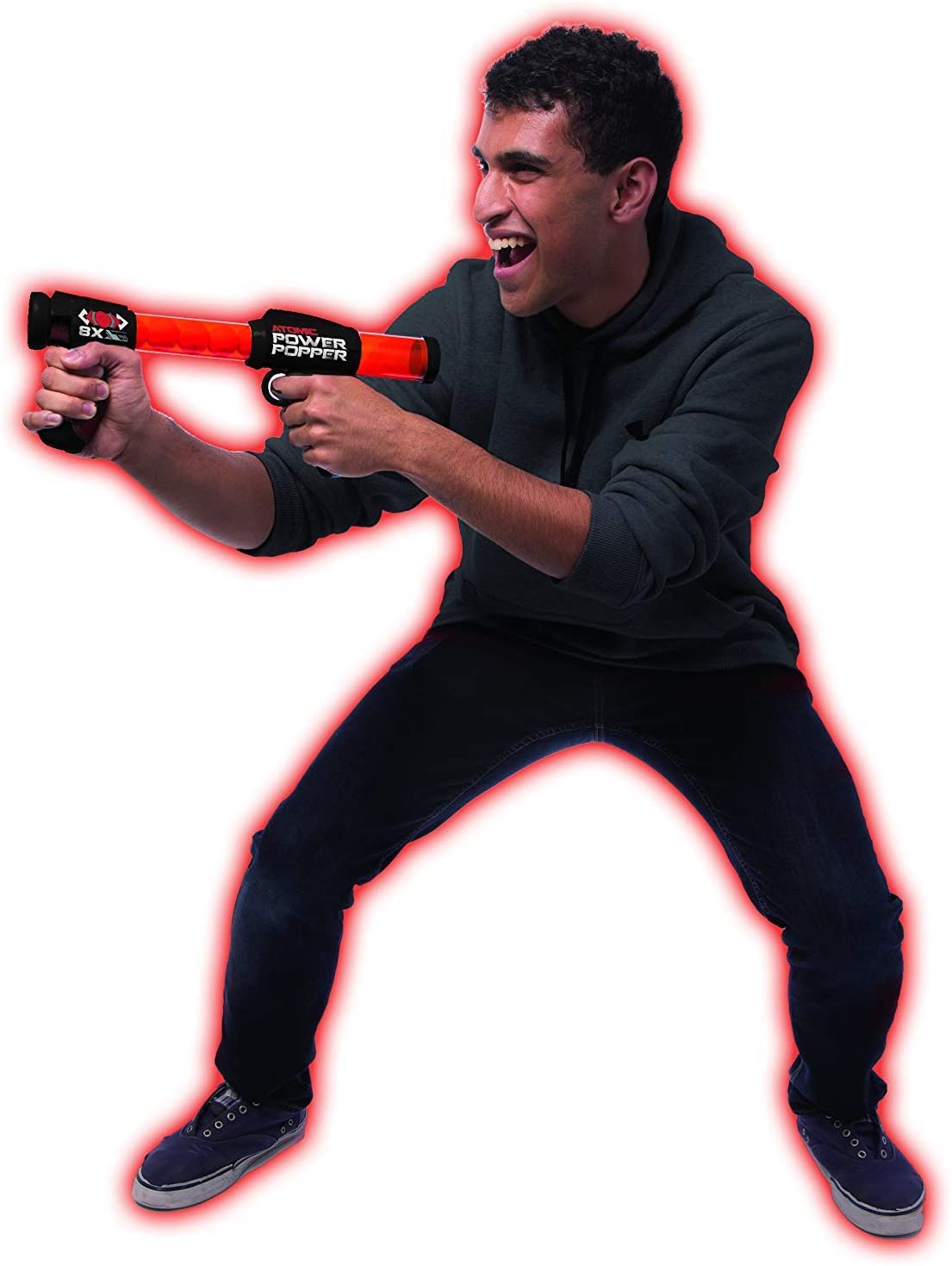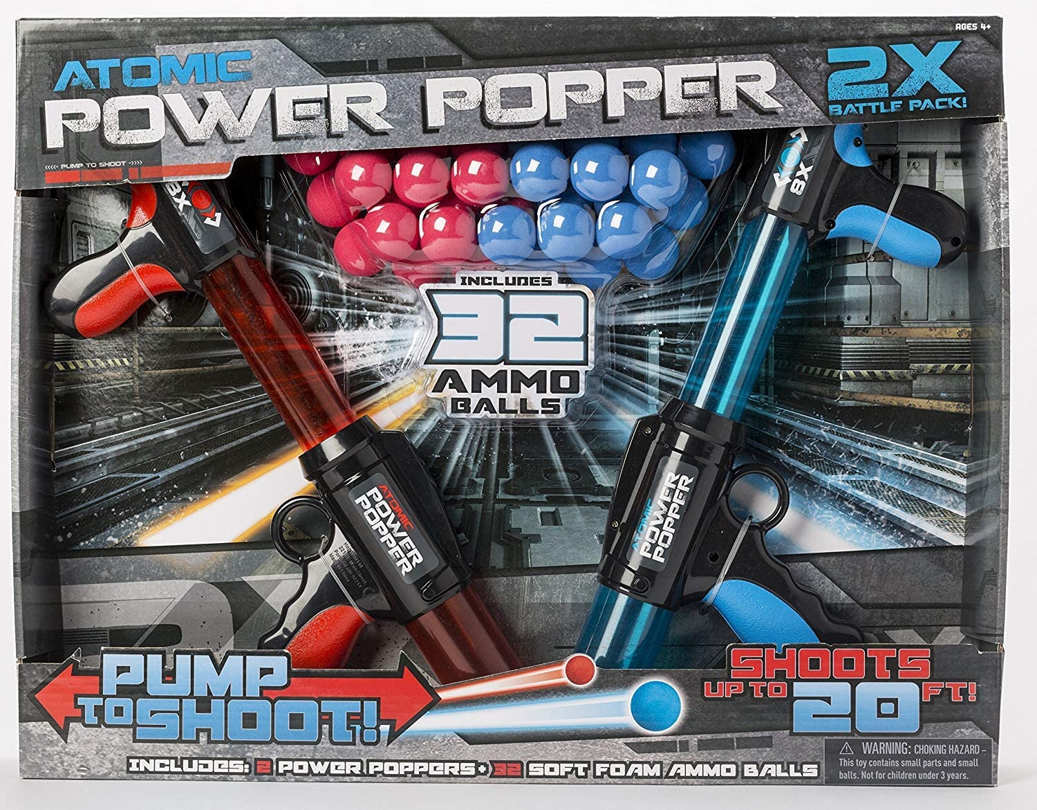 Atomic Power Popper Battle Pack Includes two Atomic power poppers for ultimate 2 Player shooting action! Red and Blue rapid fire blaster guns shoot 8 soft foam ammo balls up to 20 feet! 32 balls total included! Pump to shoot! Pump action launches the balls faster! Great for indoor and outdoor play, and makes a great fun gift! By Hog Wild Toys. For ages 4 and up. Works with all Hog Wild Popper refill balls (sold separately).