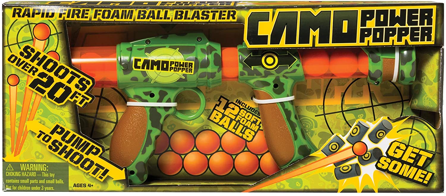 • Camo Power Popper 12X blaster gun shoots up to 12 Foam Balls!