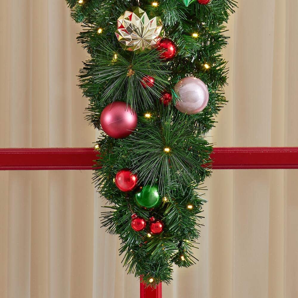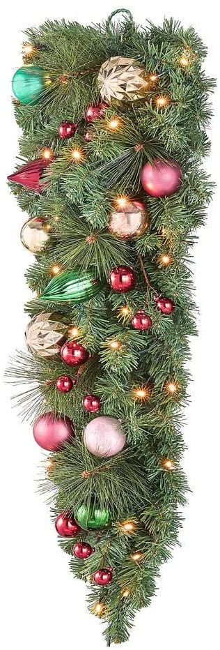 Bring a cheerful glow to the holidays with this 36 in. pre-lit Santa sleigh decorated tear drop. Illuminated with 35 warm white lights, this beautiful decoration is perfect for above your fireplace or a stairway rail. Featuring red, gold and green ornaments, it adds the perfect festive touch. The LED bulbs use up to 80% less energy than incandescent lighting for long-lasting use all season long. This pre-lit tear drop has a timer function, is rated for indoor and outdoor covered use and uses 4 AA batteries (not included).