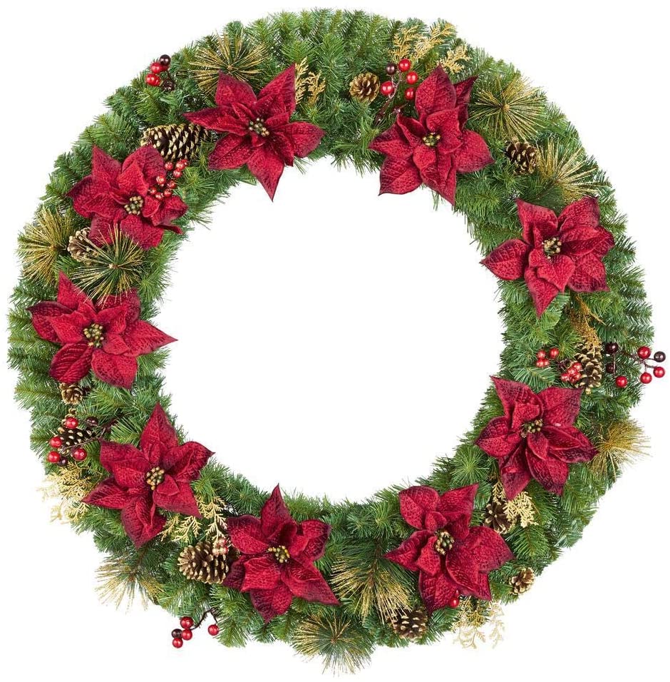 Liven up your decor with this Mixed Pine Wreath by Home Holiday Accents. Featuring burgundy velvet poinsettias with berries, pine cones and gold glitter cedar, it adds the perfect festive touch. Display it above your fireplace mantel or entryway or hang it on your door. Rated for indoor and covered outdoor use.