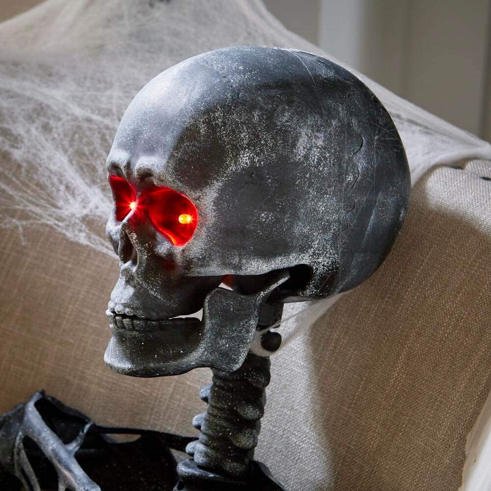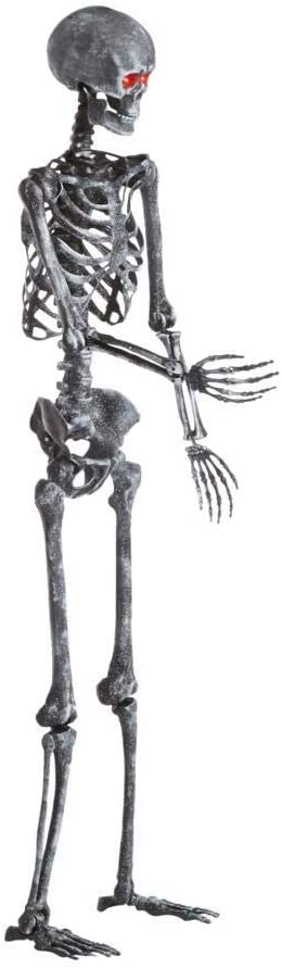 With a decayed and aged finish, this skeleton is sure to scare trick or treaters. The red, eerie glow of the eyes give this bony character an extra sinister effect. Poseable arms and legs allow for use in any Halloween display