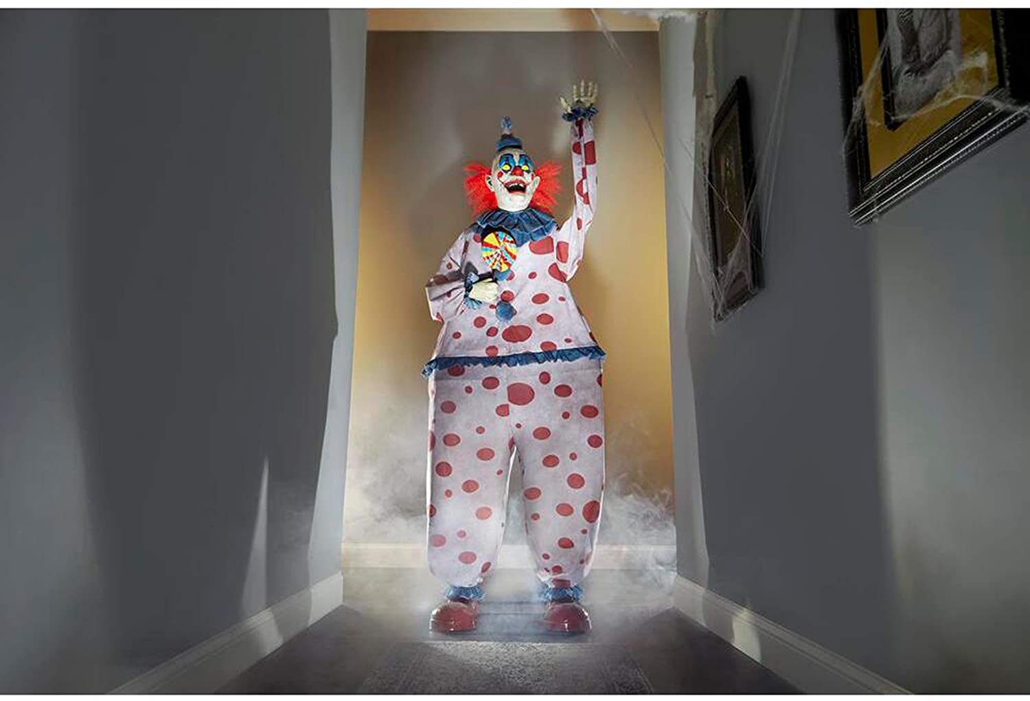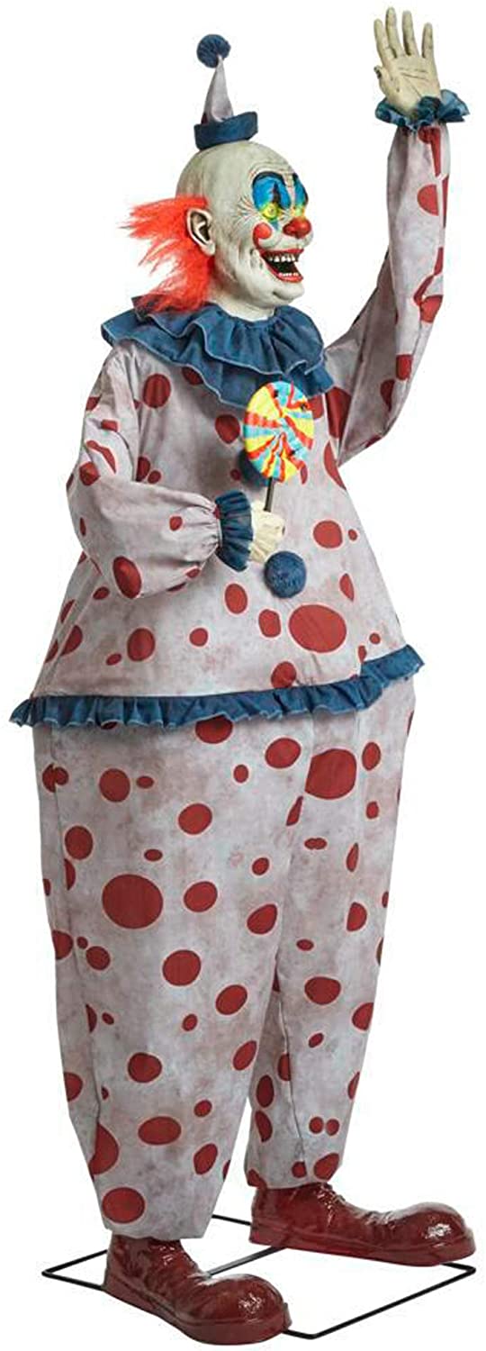 This Old Time Clown talks with moving mouth and waves his arm at you as he turns his head side-to-side. His eyes illuminate and he holds a detailed sculpted lollipop in one hand. Old Time Clown is activated by motion sensor and is ready to bring out the fun this Halloween.