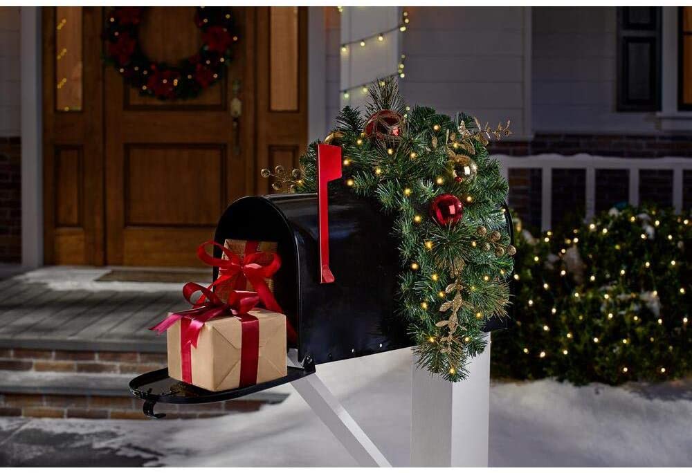 Light up the holidays with this 32 inch Royal Easton Artificial Christmas Mailbox Swag. Illuminated with 25 warm white lights, the natural-looking swag is perfect for above your fireplace or a stairway rail. It has red and gold ornaments, gold sprigs and a lacy ribbon. Its long-lasting LED bulbs use up to 80% less energy than incandescent lighting. This pre-lit garland is rated for indoor and outdoor covered use and uses 3 AA batteries (not included).