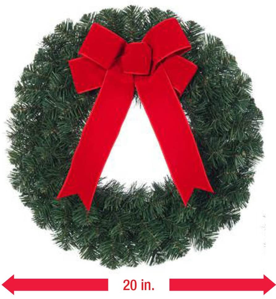 The 20 in. Unlit Artificial Christmas Wreath from Home Accents Holiday provides a classic touch of holiday warmth. Use it doors, above fireplaces or as seasonal wall decor wherever you want to add a festive look. Add lights and other decorative accents (sold separately) to customize your wreath. This set of six is crafted with durable yet lightweight PVC material, making it easy to handle and store for years of enjoyment. 20 in. diameter fits easily over any door, window, wall or above the fireplace Topped with a red velvet bow for simple, classic elegance Easy to customize with lights and accessories to achieve just the right look Indoor/outdoor design offers versatile decorating options Lightweight for easy handling and storage Crafted with durable PVC material for lasting use, year after year The wreath is 16 in. after it is fully fluffed, it measures 20 in. from tip to tip