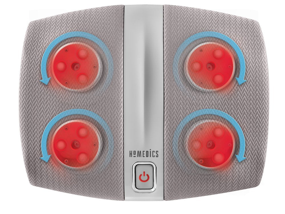 - 4 ROTATIONAL HEADS WITH 12 MASSAGER NODES: The HoMedics Heated Foot Massager has 4 rotating heads. Each head has 3 nodes. That’s a total of 12 massager nodes that are designed to target acupuncture points on each foot, giving you a relaxing massage from heel to toe