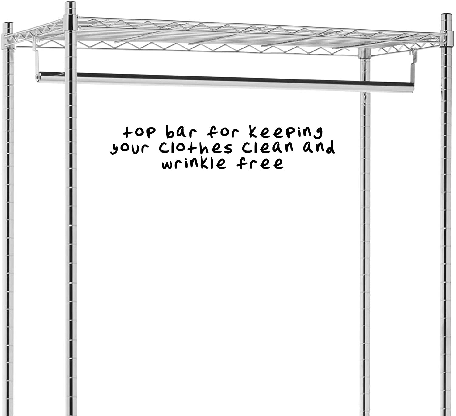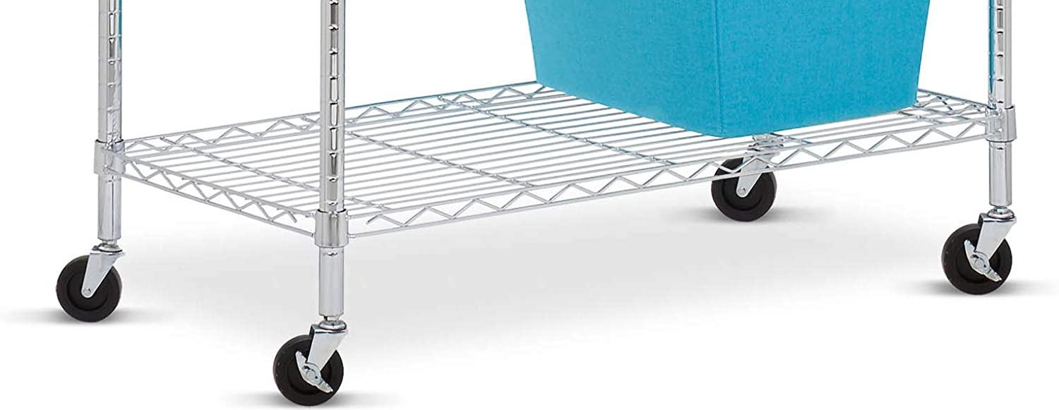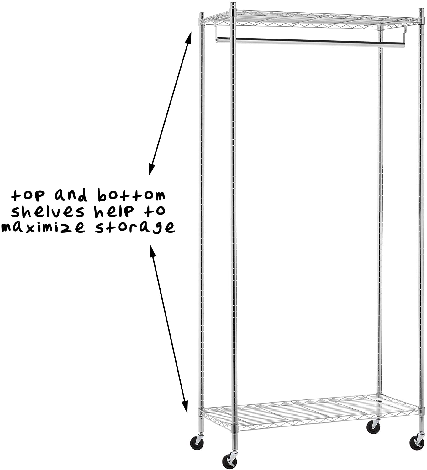 Honey-Can-Do GAR-01120 Heavy Duty Rolling Garment Rack. This convenient rack has both a top and bottom shelf. It was designed to fit the changes in your life with adjustable height, making long coats and garments much easier to accommodate. The rack was built heavy duty steel shelves and throughout has sturdy steel construction. The unit has twin locking casters so that it is more easily moved or locked in place. It also comes with a limited lifetime warranty. The dimensions are 74.8-Inch by 35.8-Inch by 19-Inch