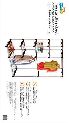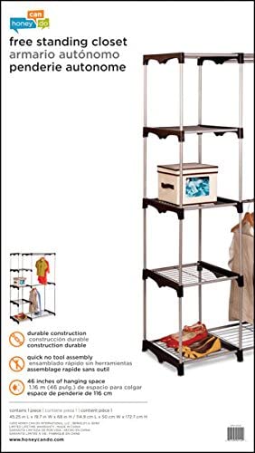 Honey-Can-Do WRD-02124 Double Rod Freestanding Closet. Made of durable steel and plastic construction. Freestanding double rod wardrobe closet is portable. Keeps clothing organized with 4-tier stacking shelves and dual rods for hangers. Easy setup-no power tools required for assembly. Steel and plastic construction give closet strength for years of maintenance free use. Product Dimensions of 45.25L x 19.7w x 60h.