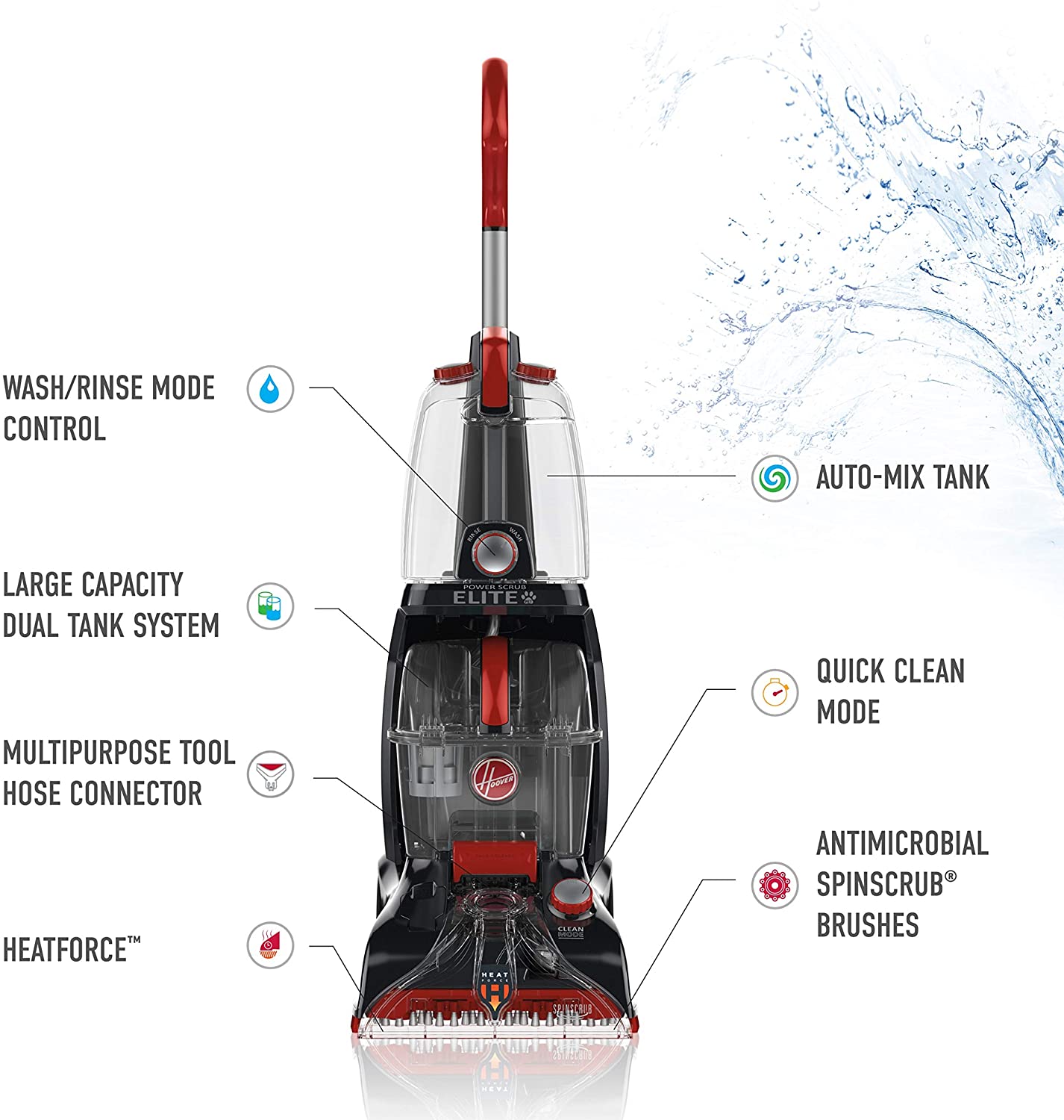 Hoover Power Scrub Elite Pet Carpet Cleaner FH50251PC was designed for improved cleaning performance and superior drying. It features two modes, Deep Clean and Quick Clean, to help you tackle all of your cleaning needs. Deep Clean Mode powerfully removes embedded dirt and stains for whole home cleaning, while Quick Clean Mode with Heat Force speeds up drying to allow carpets to dry in less than 45 minutes - getting you back on your floors faster. Our Spin Scrub Brush System helps prevent odors and bacteria from forming in the tool when you are tacking the toughest pet messes and Wash/Rinse Mode removes solution residue to deliver a powerful clean. The Hoover Power Scrub Elite Pet Carpet Cleaner was created with active families in mind – now you can clean easier, so you can get back to what matters most. Motor Amps: 10 Amps.
