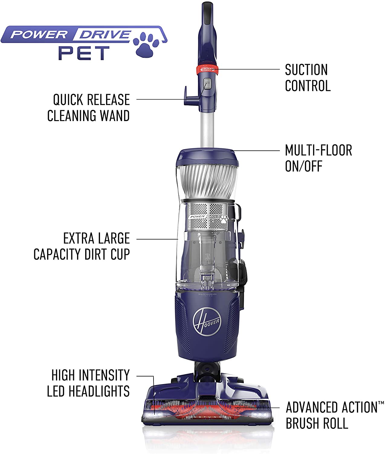 Hoover PowerDrivePet Upright Vacuum UH74210PC is perfect for homes with pets. It combines the power and suction you trust to deliver a deeper clean. Its swivel steering design effortlessly maneuvers around furniture and into tight spaces with ease, while the new Advanced Action Brush Roll is engineered to tackle deep-down embedded dirt and reduce hair wrap. The ON/OFF brush roll feature allows you to transition from carpet to hard floor with the touch of a button to optimize pet hair removal on all floor types. Turn the brush roll ON for deep cleaning on carpets and OFF to prevent scatter of debris on hard floors. With 13 ft. of cleaning reach, multipurpose pet tools, and an extra-large capacity dirt cup, you’ll be able to achieve a whole home clean so you can love your pets, not the hair they leave behind. For over 100 years, Hoover has reimagined the way we clean, delivering a complete collection of trusted, innovative and effective solutions designed to make cleaning easier for active families so they can get back to what matters most.