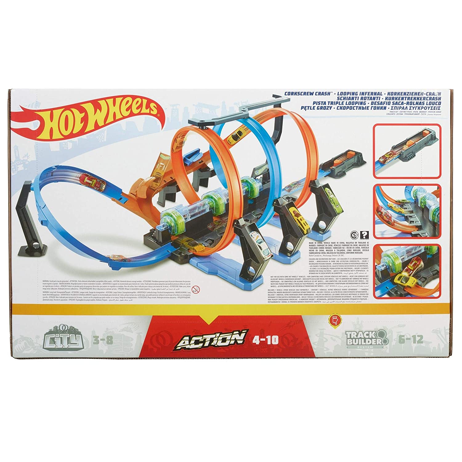 The Hot Wheels Corkscrew Crash Track Set is the ultimate set for speed and motorized boosted action! The unique corkscrew design sends cars flying around the track at dizzying speeds and crashing and smashing through the triple loop with 3 high-action crash zones and 3 high-speed boosters. This interactive, skill-based set drives problem solving with exciting Hot Wheels action as kids try to launch their cars without crashing out. Kids test their skills by timing a launch into the corkscrew madness without wiping out in one of the three wild crash zones! Send more cars into the action with the drop-in ramp to increase the fun and the challenge. This massive set is great fun for one or two players. Comes with 1 Hot Wheels car. Connects to other Hot Wheels sets for an epic world of Hot Wheels thrills.