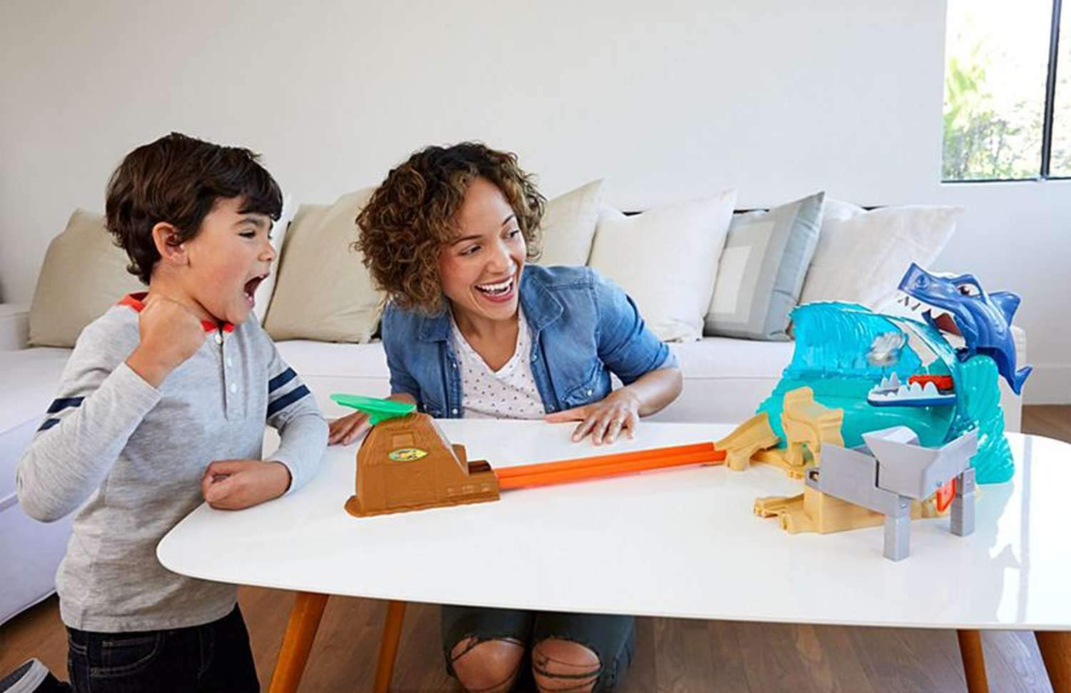 Save Hot Wheels City from the Giant Shark! Fuel kids imagination and inspire an adventure play when a giant Shark attacks Hot Wheels City and threatens the Hot Wheels Surf Competition. This racetrack and seaside playset is ideal for hours of storytelling action: launch a car from a tiki hut launcher and race through the waves; look out for the Shark's bite or get captured in his massive jaws! Launch another car to save the trapped vehicle; take aim and slam into the Shark to defeat him! And when the shark is defeated or kids just want another challenge, they can take it up a notch and try to score lots of points in the surf competition by drifting on the wave and landing in the grandstands. Shark Beach Battle Play Set is designed to be easy to reset, with no loose parts and will be the ideal centrepiece for an awesome Hot Wheels City, as it’s directly connectable with other Hot Wheels City playsets so you can easily build whole town of adventure tracks and fun.
