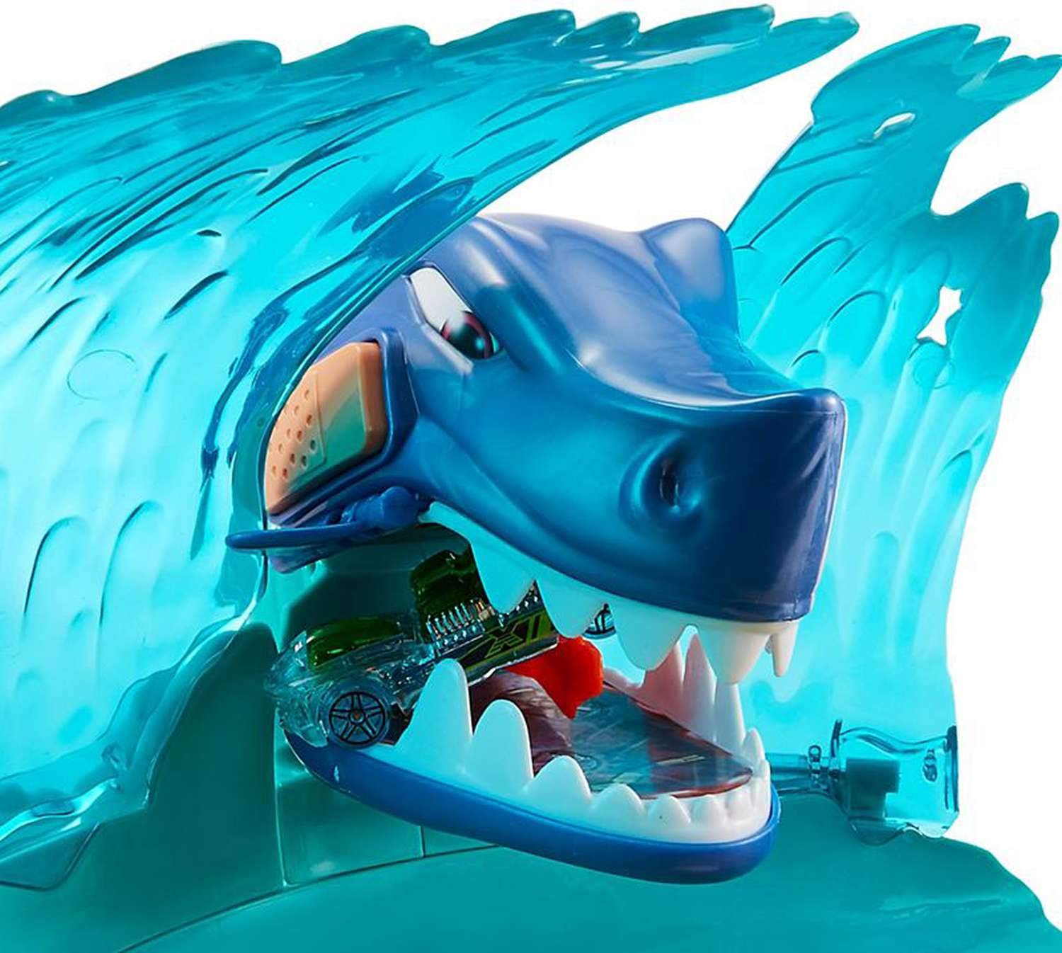 - Huge city shark beach battle playset with a beach-themed location and menacing shark with massive jaws that chomps cars