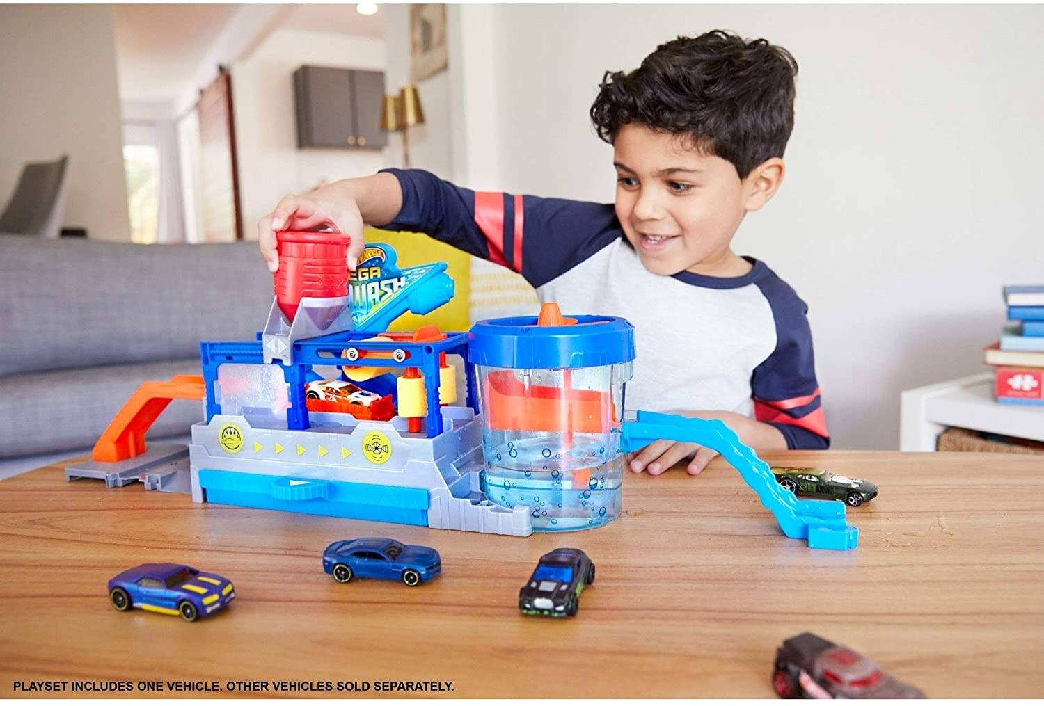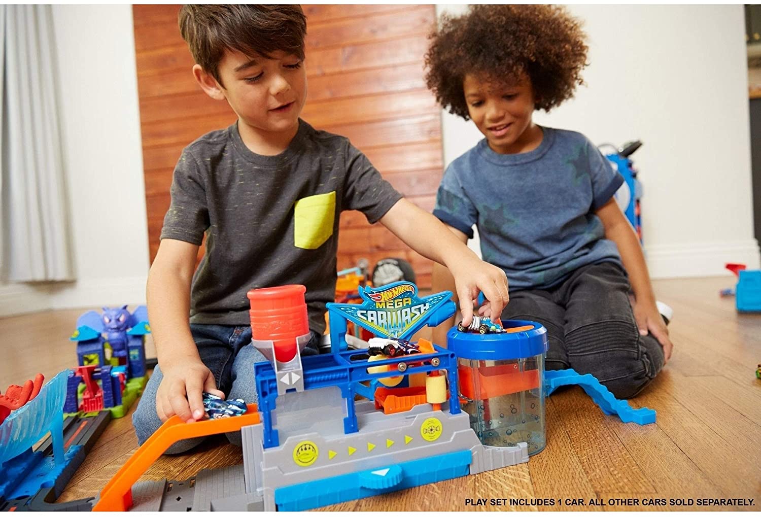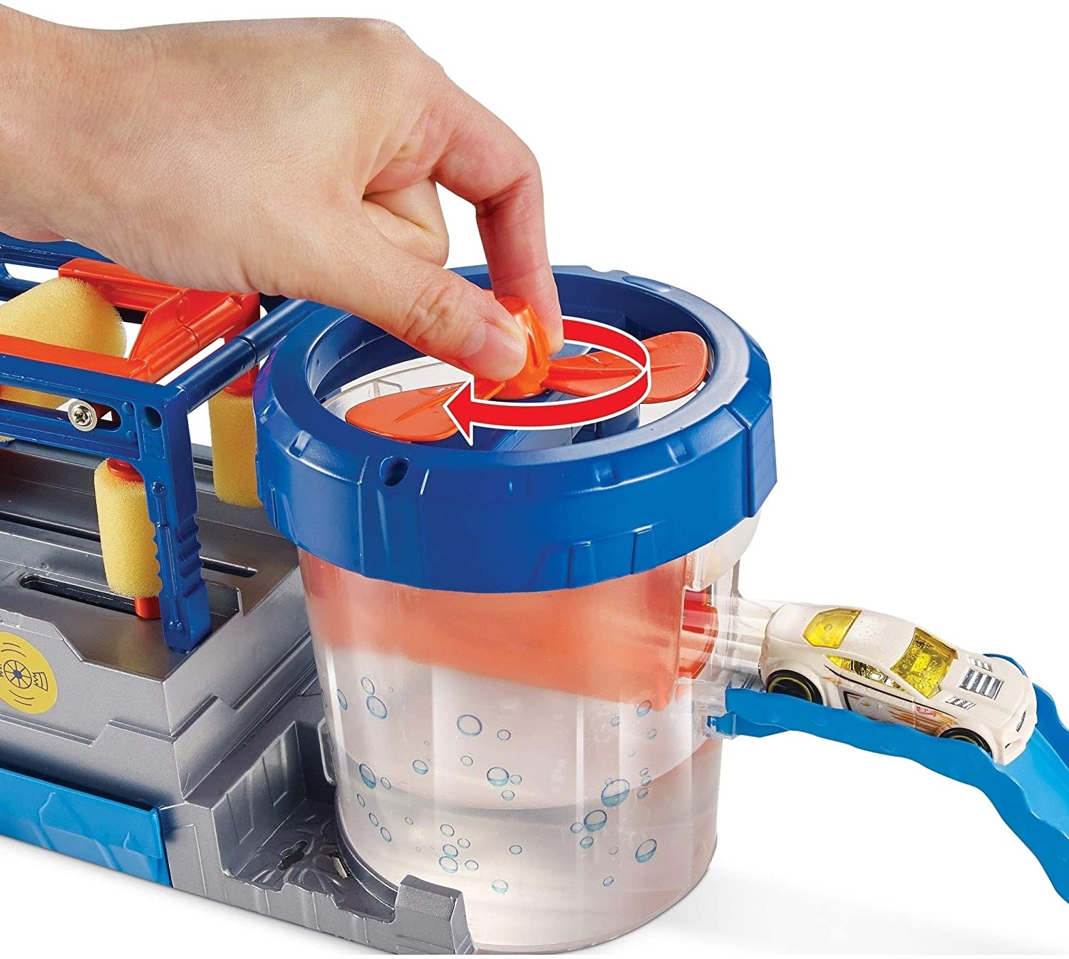 4 years & up. Take your Hot Wheels Ride through a spin in the Hot Wheels Mega car wash! Pull the handle back and drive your car into the car wash to begin riding the automatic conveyor belt. Squeeze warm water onto the color Shifters car and it magically changes color. Towel dry The vehicle before it descends into the dunk tank for another color change transformation. Raise the car and dry It off by spinning the fan. Mega car wash has multiple connector points that allow it to easily attach to other Hot Wheels track sets.