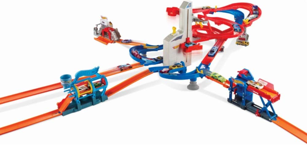 Hop in the driver's seat and take your Hot Wheels cars for a spin on the Mega Metropolis track set. This package includes 13 pieces of tracks, 23 connectors and 10 Hot Wheels vehicles to help you build your own Hot Wheels city. This Mega Metropolis track set comes complete with a vehicle elevator, roadside repair store, pizza shop and car wash.