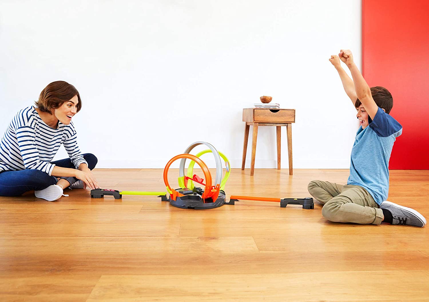 • Crank up the competition as challengers strategically launch their Hot Wheels cars into the rotating set