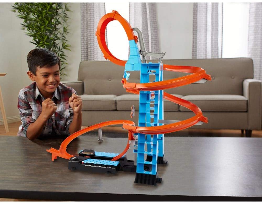 - The track set is designed for the ultimate crashing and racing action with a tower for storing 20+ cars that rises 32 in / 83 cm high!