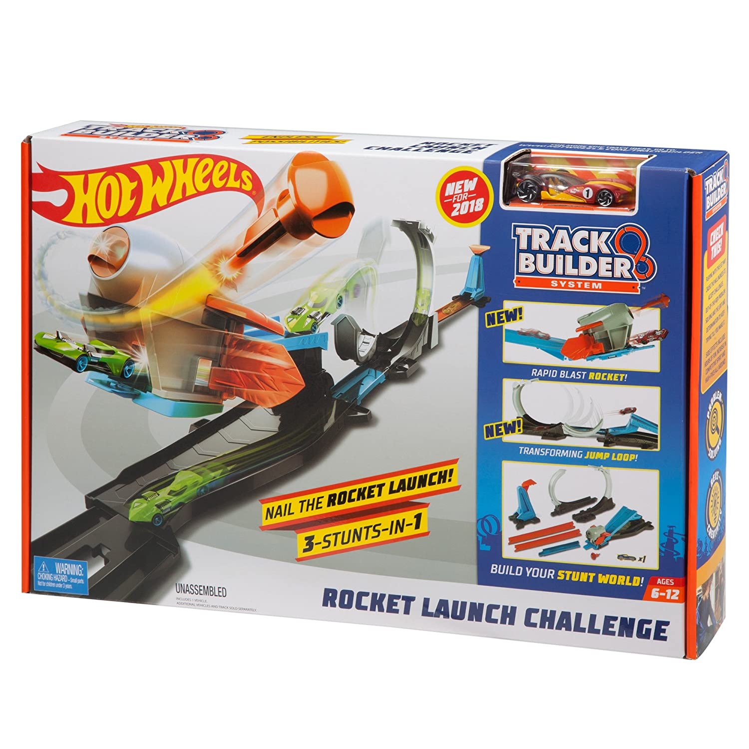 Launch thrilling playtime with a transforming set that features multiple challenges and an epic payoff! kids will have a blast completing three stunts to send the rocket flying. First, hit the launcher to speed through the loop and ignite the rocket — one of the engines pops out, and the loop automatically collapses into a ramp. Next, launch the car to jump the monster gap, ignite the second engine, and raise the ramp that preps the rocket for liftoff. Then it’s time for the final countdown — race up the ramp and blast off the rocket cap! this action-packed set provides continuous play with no setup required between challenges, and it connects to other track Builder sets for endless stunting fun!