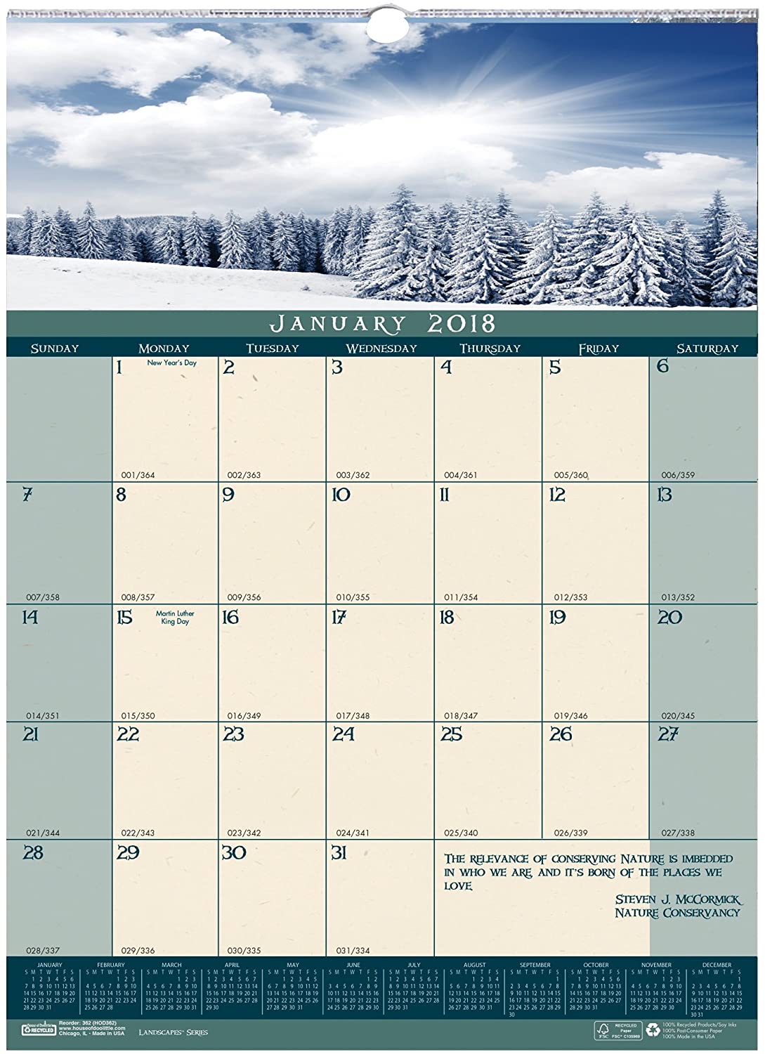 Since 1919, House of Doolittle has manufactured quality dated products made in the United States that help you be more productive during your daily planning activities. Thirty-one years ago we made the commitment to produce all of our products using recycled paper and materials. This House of Doolittle Earthscapes landscapes monthly wall calendar features 12 months for easy planning, from January 2018 to December 2018. This calendar has 1.6" x 2" blocks allocated for each day and includes a wire hanger to easily hang the calendar on the wall. Each calendar page contains a beautiful landscape image printed on heavy 70# cream paper for an unique effect. Other products from House of Doolittle include desk pads, wall calendars, desk pad calendars, teacher planners, office calendars, professional appointments books, laminated wall calendars, blotter pads, monthly appointment planners and weekly appointment planners. Go Green with House of Doolittle products, as we use 100% recycled paper containing 100% post-consumer waste with soy-based inks and 90% recycled wire. All of our products are manufactured in the USA and are FSC certified. Since 1989 House of Doolittle has donated 5% of its profits to organizations that are working to create a more sustainable environment.
