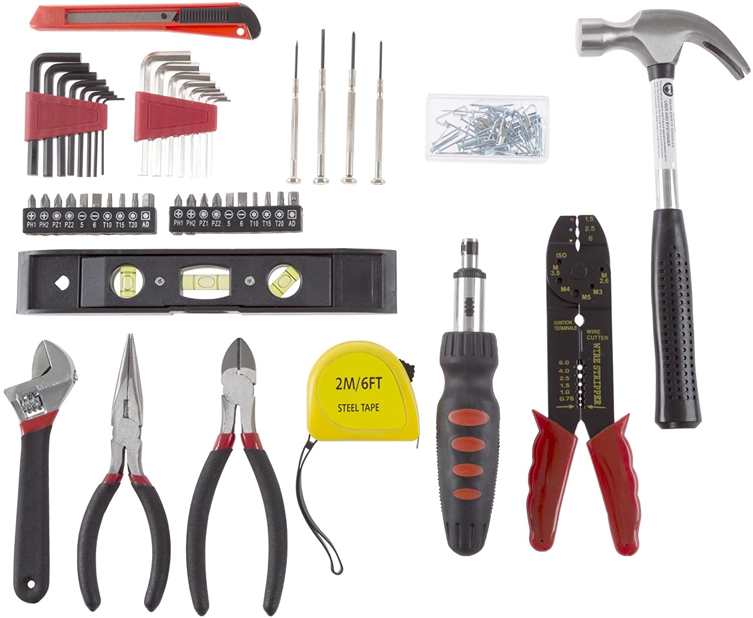 - SET INCLUDES – Two 8-piece Allen Wrench Sets, Two 10-piece Driver Set with PH1, PH2, PZ1, 5, 6, T10, T15, T20 and ADP drivers, Ratcheting Screwdriver, Side Cutters, Needle Nose Pliers, Adjustable Wrench, Claw Hammer, 6 feet Steel Tape Measure, Snap Blade Razor, Miniature Screwdriver Set with 2 Slotted and 2 Philips, Wire Stripper, and assorted small hardware.