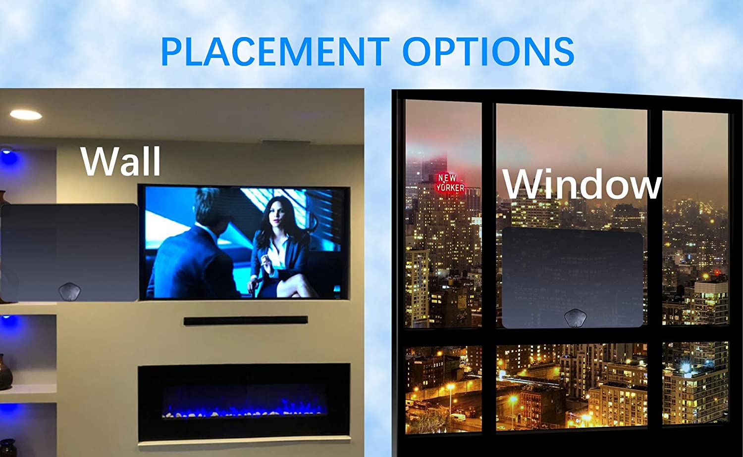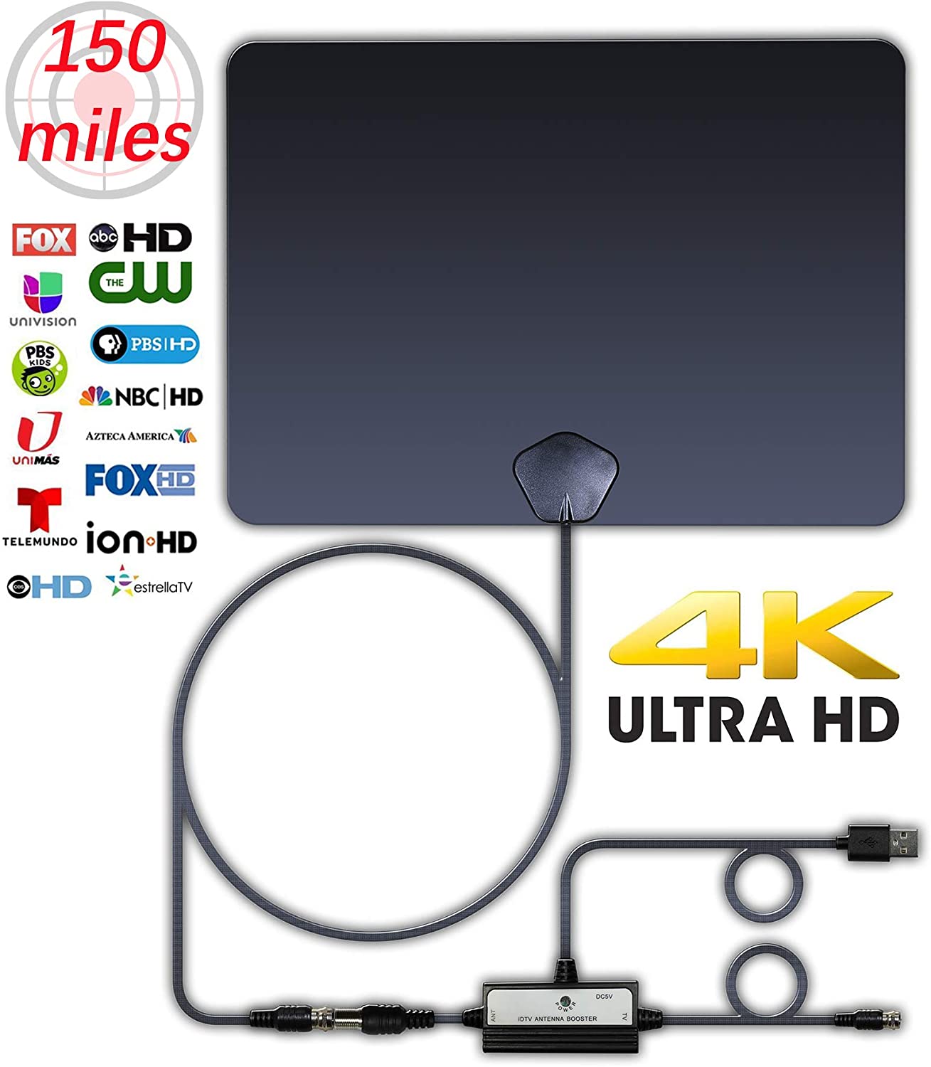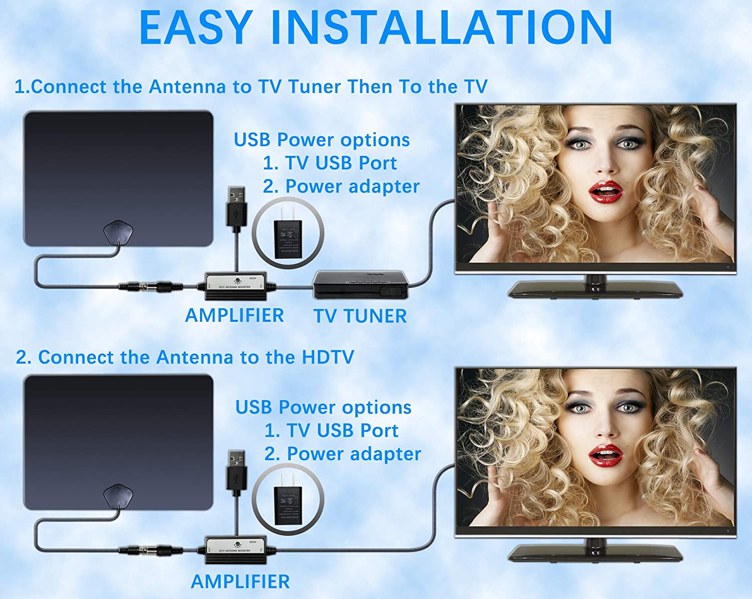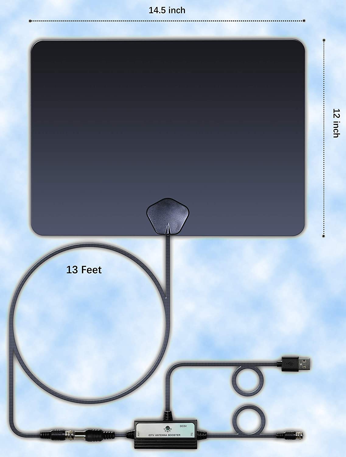 Amplified HD TV Antenna with Free Channels for Life ! The 1080p HDTV reception ensures that you always have the highest quality content. Depending on your location, the hdtv antenna can receive include NBC, FOX, CBS, ABC, PBS, THE CW, QUBO, TELEMUNDO, UNIVISION, RTV, THIS TV, ION, ME TV and the weather channel. Specifications: Size: 13 x12 x 0. 03 inches Frequency Range: VHF 47-240Mhz, UHF 470-862Mhz Receiving Range: FM/VHF/UHF V. S. W. R: less than or equal to 1. 5, Max: 1 Gain: 28 dB(with amplifier) Impedance: 75 ohm Noise Figure: What you get with the antenna 1x HDTV Antenna with integrated 13. 5 ft. Coaxial Cable 1x Detachable Amplifier 1x USB spare cable 1x Instruction manual 3x 3M Adhesive Mounting Stickers 150 Miles Digtial TV Antennas with 13.3ft long copper coaxial cable 1. Receives free High Definition TV broadcast signals (such as ABC, CBS, NBC, Fox, The CW, and PBS). Supports 1080p HD. 2. Can be easily hidden from view behind a picture, bookshelf or television. 3. Fast setup in 3 easy steps – Unwrap, Plug in, and Scan channels. IMPORTANT: If your antenna is not working as expected 1.)Make sure you have correctly connected the antenna to your HDTV or third-party HD receiver 2.)Set the mode to Antenna or Air in the TV's setup menu and re-scan for channels. 3.)Antenna signal strength can vary depending on distance from the tower, terrain, and weather. If needed,Reposition the antenna in a different location, such as higher on a wall or closer to a window,Facing the direction of the broadcast tower,Always re-scan for channels after moving the antenna. 4.)If a signal cannot be received ,please placing the antenna higher or close to/in a window may result in better reception, remember to re-scan after each move.