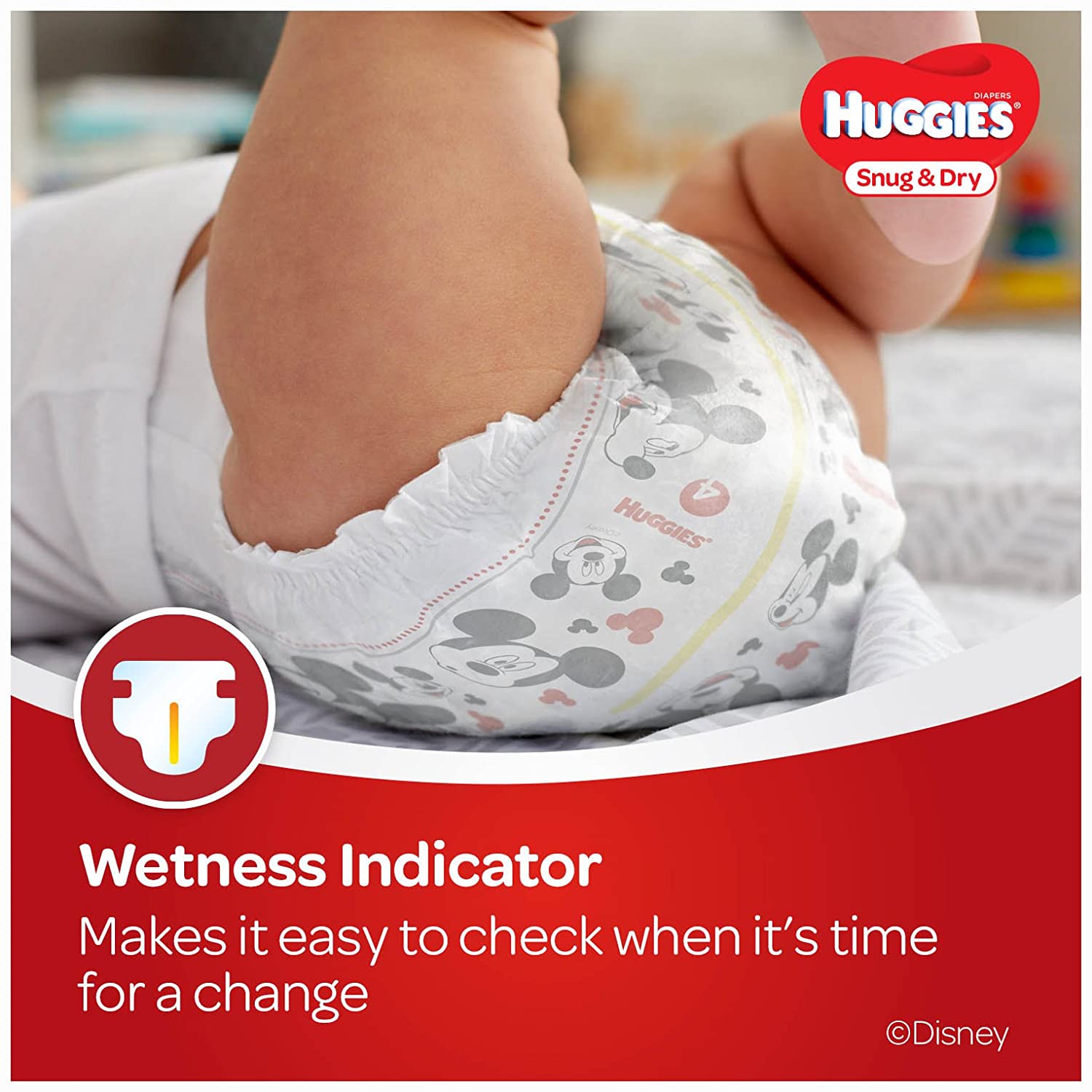 HUGGIES Size Three Snug & Dry Diapers give your baby great protection at a great value. Four layers of protection absorb moisture quickly to help stop leaks for up to 12 hours, and a quilted liner helps to keep your baby dry and comfortable. Plus, Snug & Dry disposable baby diapers have a wetness indicator stripe on the outside that changes from yellow to blue when wet, which helps take the guesswork out of diaper changes. Featuring fun Disney Mickey Mouse designs, Snug & Dry Diapers are available in sizes Newborn (up to 10 lb.), 1 (8-14 lb.), 2 (12-18 lb.), 3 (16-28 lb.), 4 (22-37 lb.), 5 (27+ lb.) and 6 (35+ lb.). Join HUGGIES Rewards to earn points on every pack of HUGGIES diapers and wipes you buy.