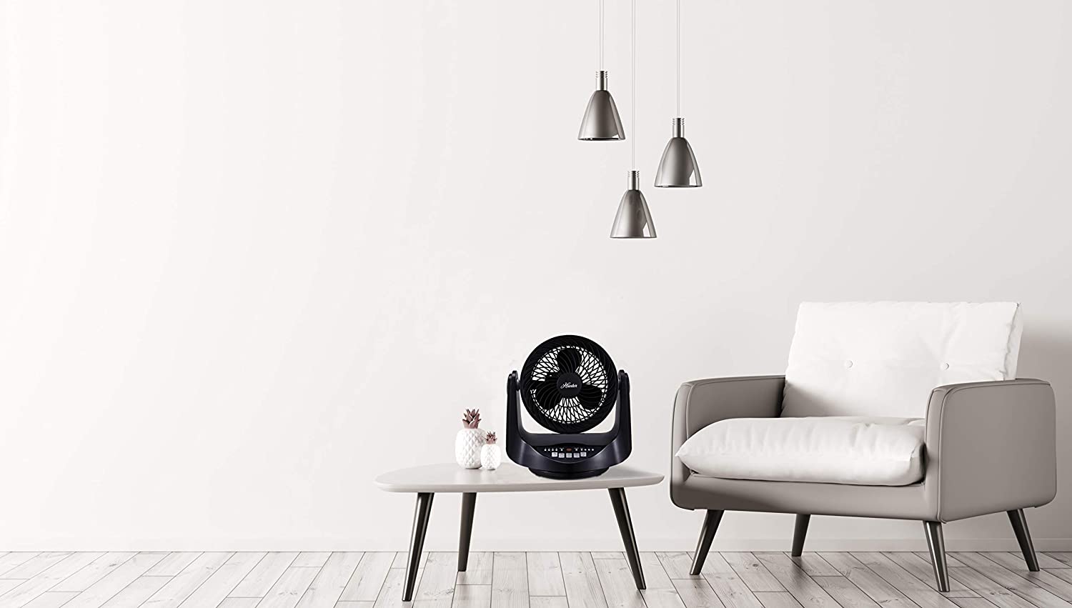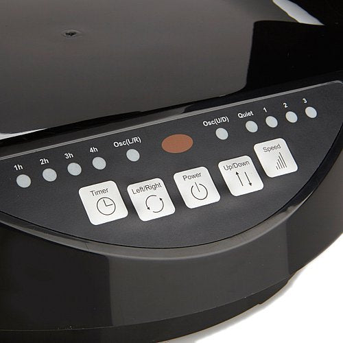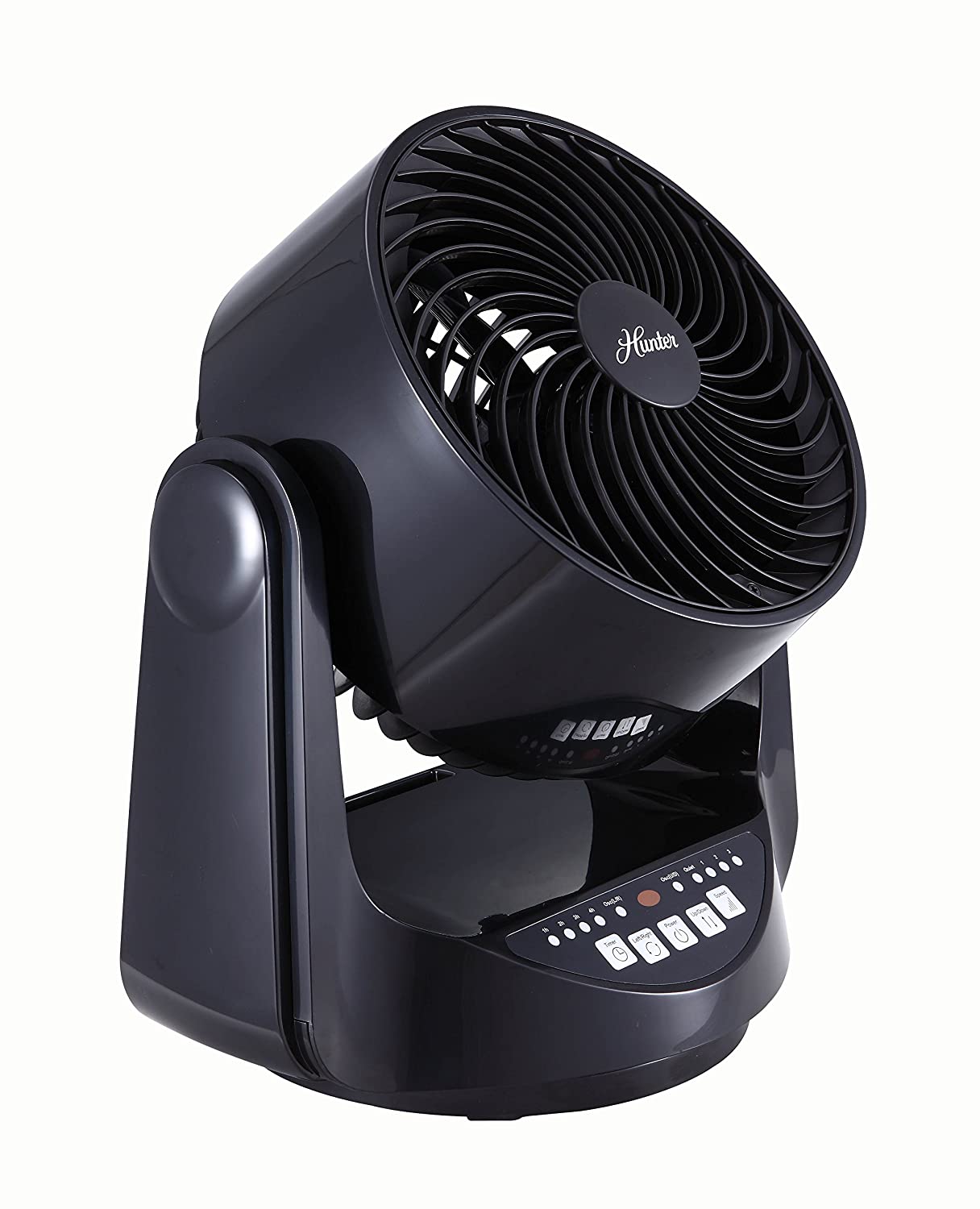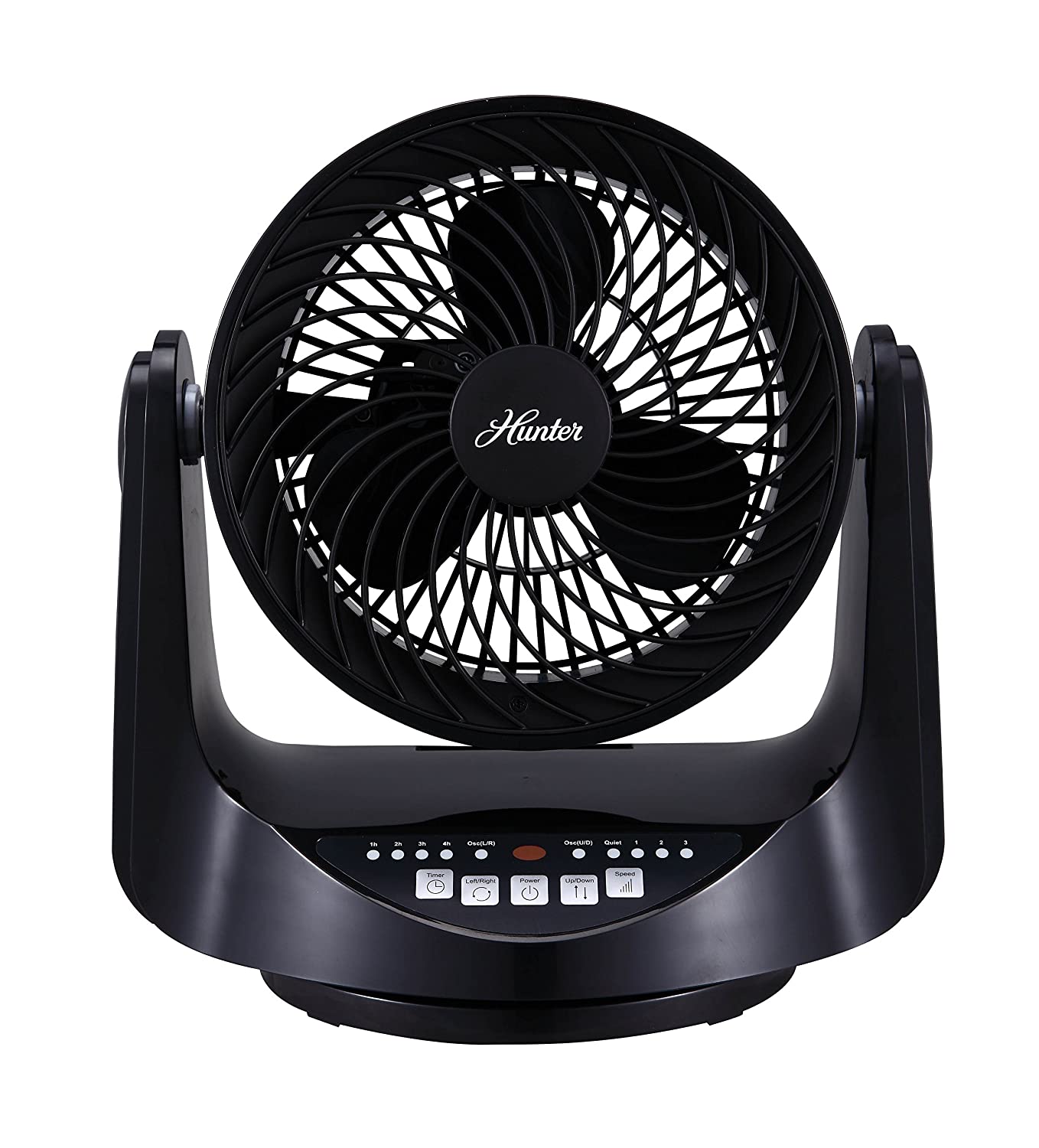 The Hunter Home Comfort 9-in. Whole room table fan (black) features a modern, aerodynamic design for low noise and provides whole-room air circulation. The fan oscillates up, down, left and right as well as just left to right, and the front pivots up to 90deg for precisely directed airflow. The control panel at the base make operation super easy and safe there's no manual twisting and adjusting of the fan.