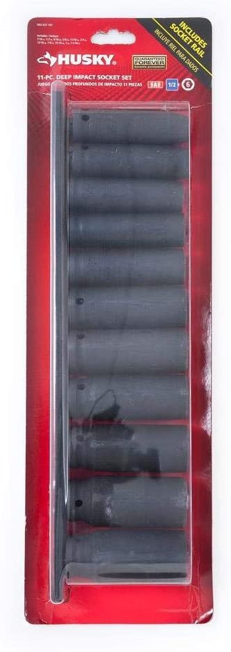 Husky 11-Piece 1/2 in. Drive 12-Point SAE Deep Impact Socket Set includes Impact Sockets made from that feature carbon steel for enduring use. The finish provides resistance to corrosion. Chamfered lead-in for quick and easy placement onto fasteners. 1/2 in. drive: 7/16 in., 1/2 in., 9/16 in., 5/8 in., 11/16 in., 3/4 in., 13/16 in., 7/8 in., 15/16 in., 1 in. and 1-1/16 in. (SAE only) Large size markings for easy readability Durable Wipes clean easily