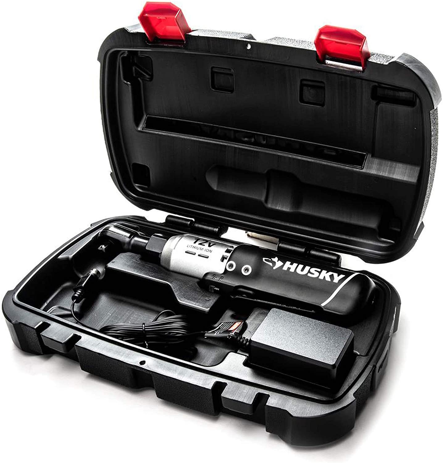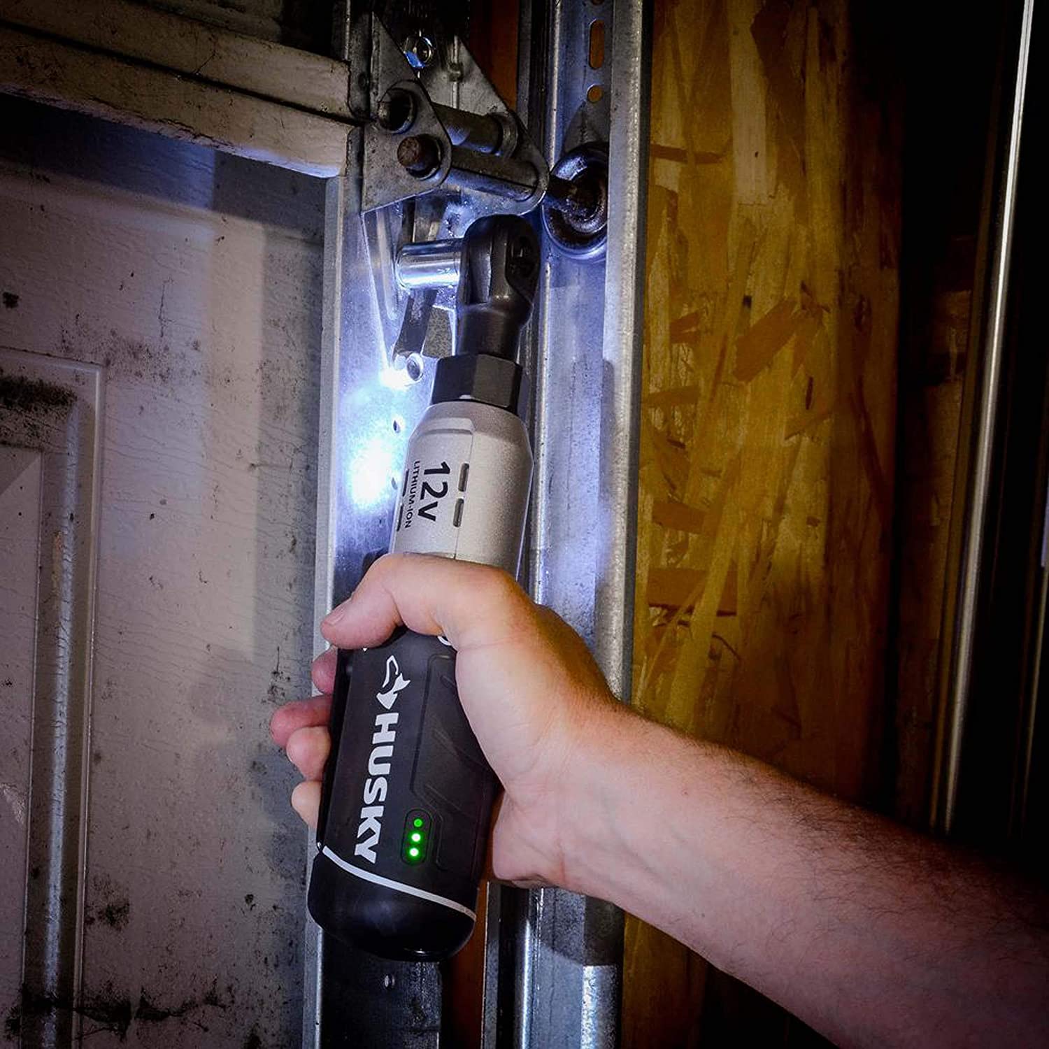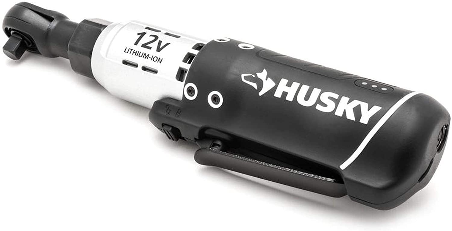 The Husky 3/8 in. drive cordless ratchet features a 12-Volt Lithium-Ion battery that produces 230 RPM. The low profile head and built-in LED lights provide end users with the means to see and access tight working areas. The Ratchet can produce up to 30 ft./lbs. of powered torque. Long-lasting internal 12-Volt lithium-ion battery with charge Variable speed lever for precise control Powered or manual ratcheting operation 230 RPM for rapid tightening and loosening of fasteners Low-profile head gets into tight spots Charging time 1.5-hours Built-in LED light illuminates work area Ergonomic non-slip grip zone Overload protection for longer life Powered torque up to 30 ft./lbs. and manual torque up to 150 ft./lbs. 240 fastener cycles per in a single charge