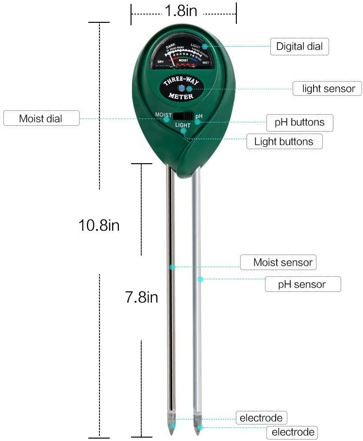 - 3-in-1: tests moisture, pH value and light level using two 20cm probe and a light sensor